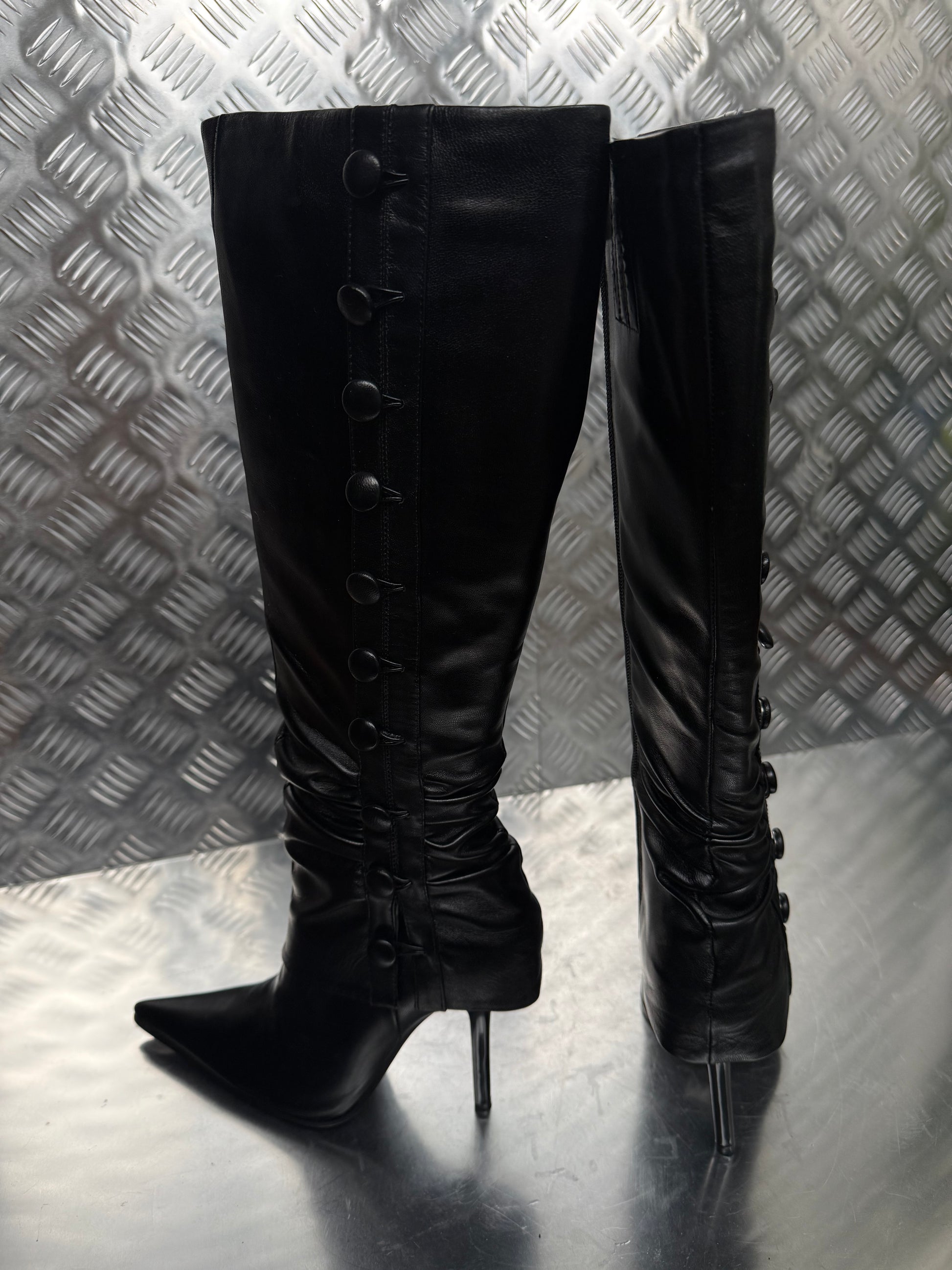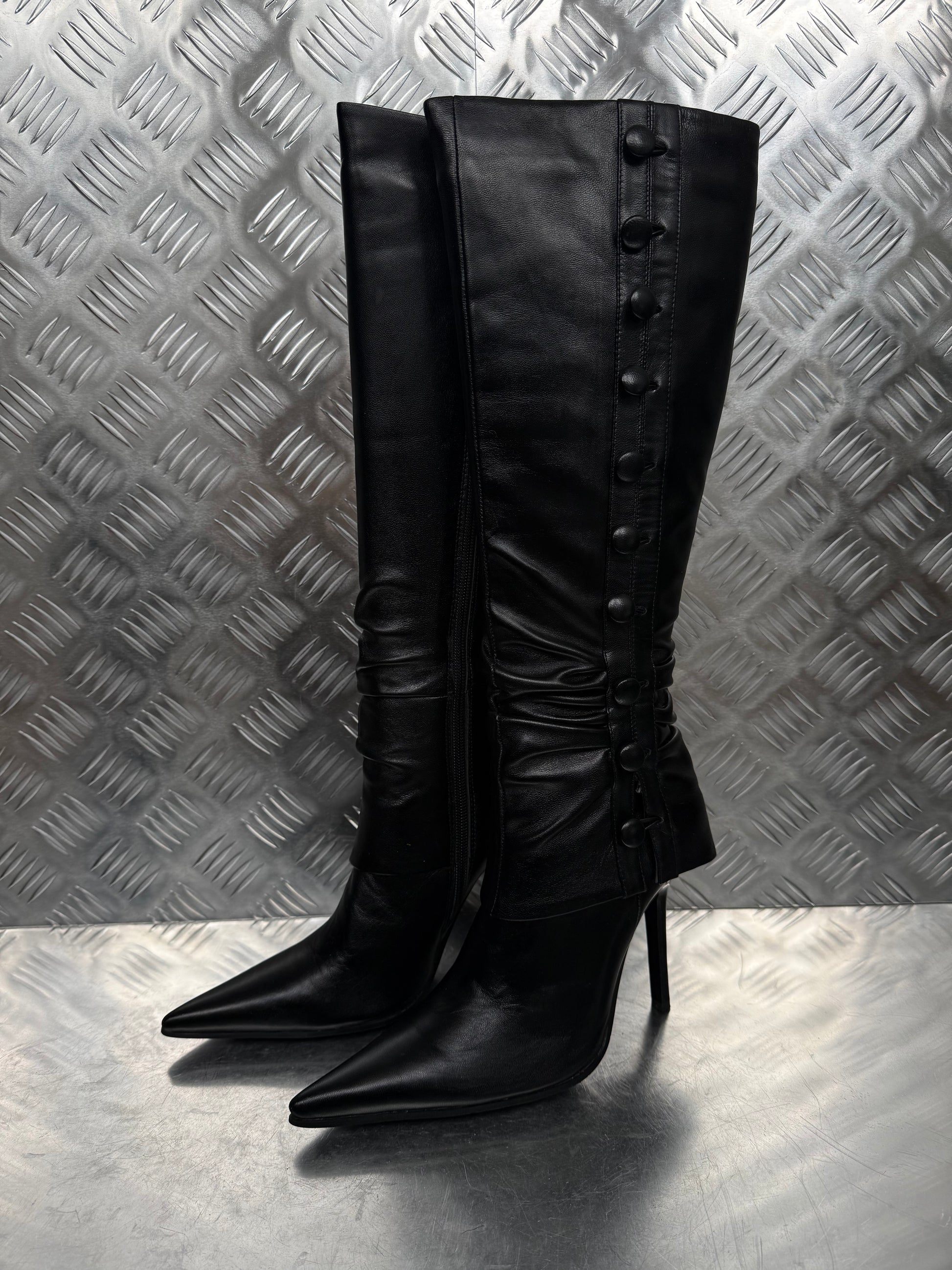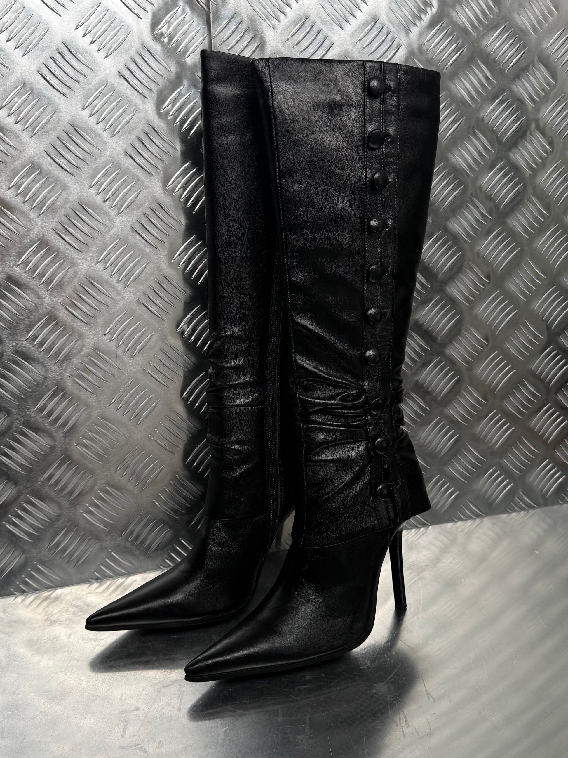 Vintage tall black leather boots with a sharp pointed toe and sleek stiletto heel. Elegant gathered leather detail along the side with covered button accents — refined and striking silhouette. Perfect structure, clean leather, and exceptionally well-preserved. Excellent condition.