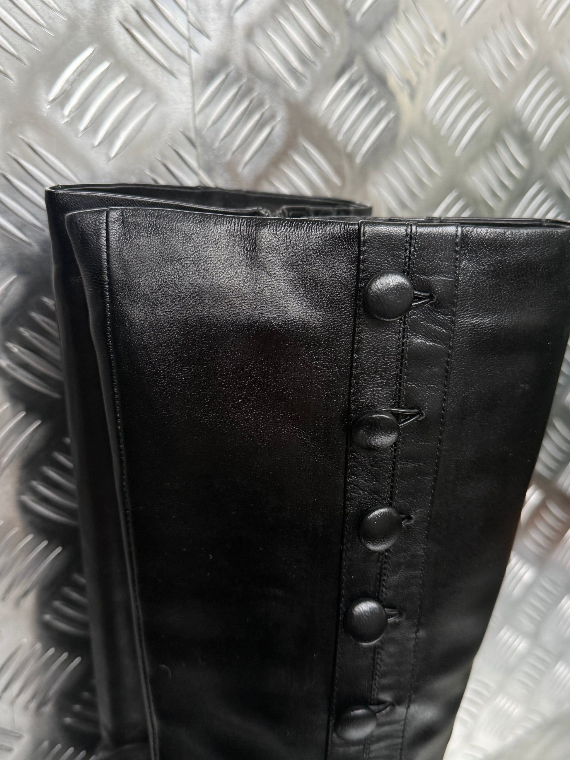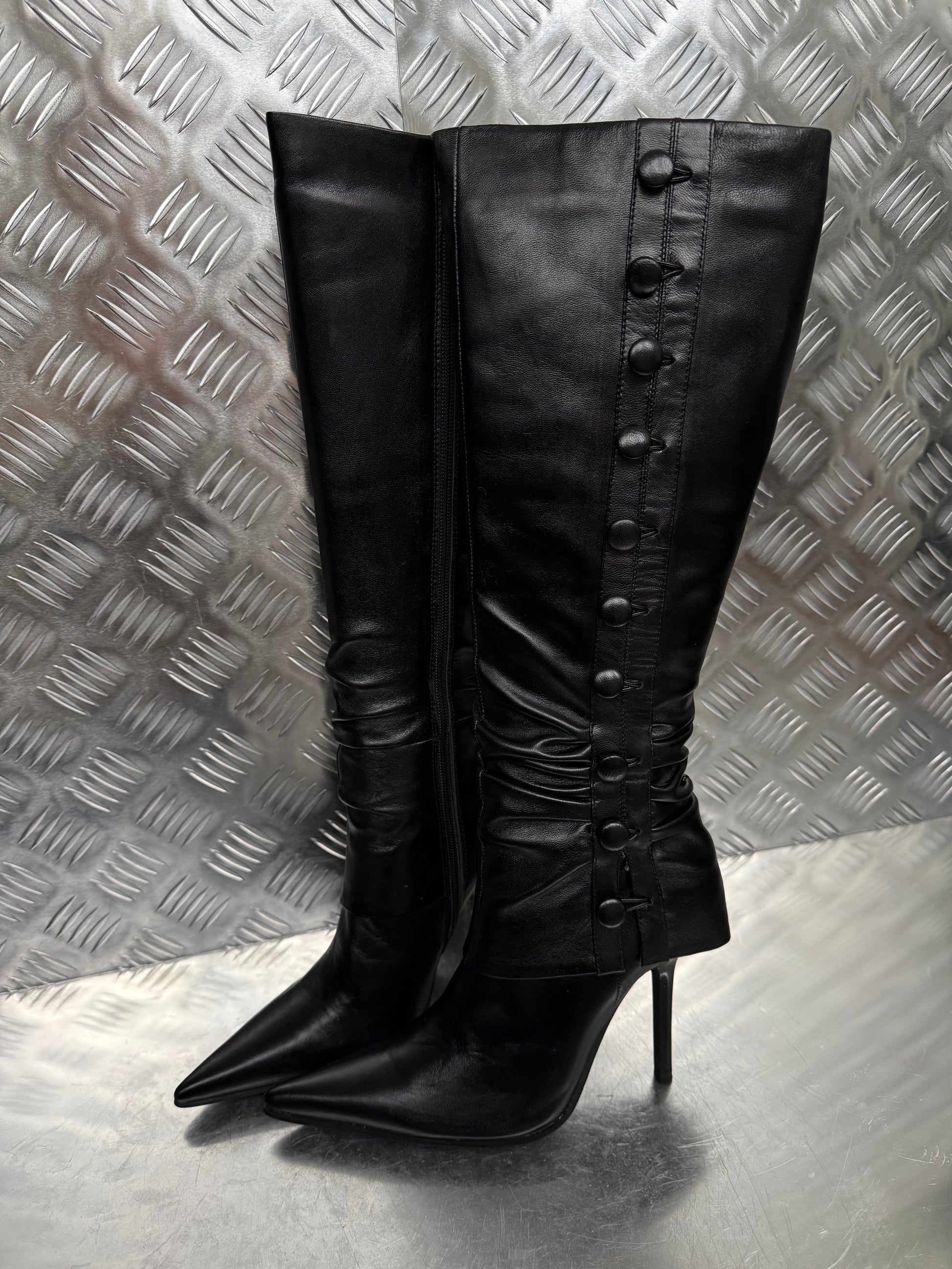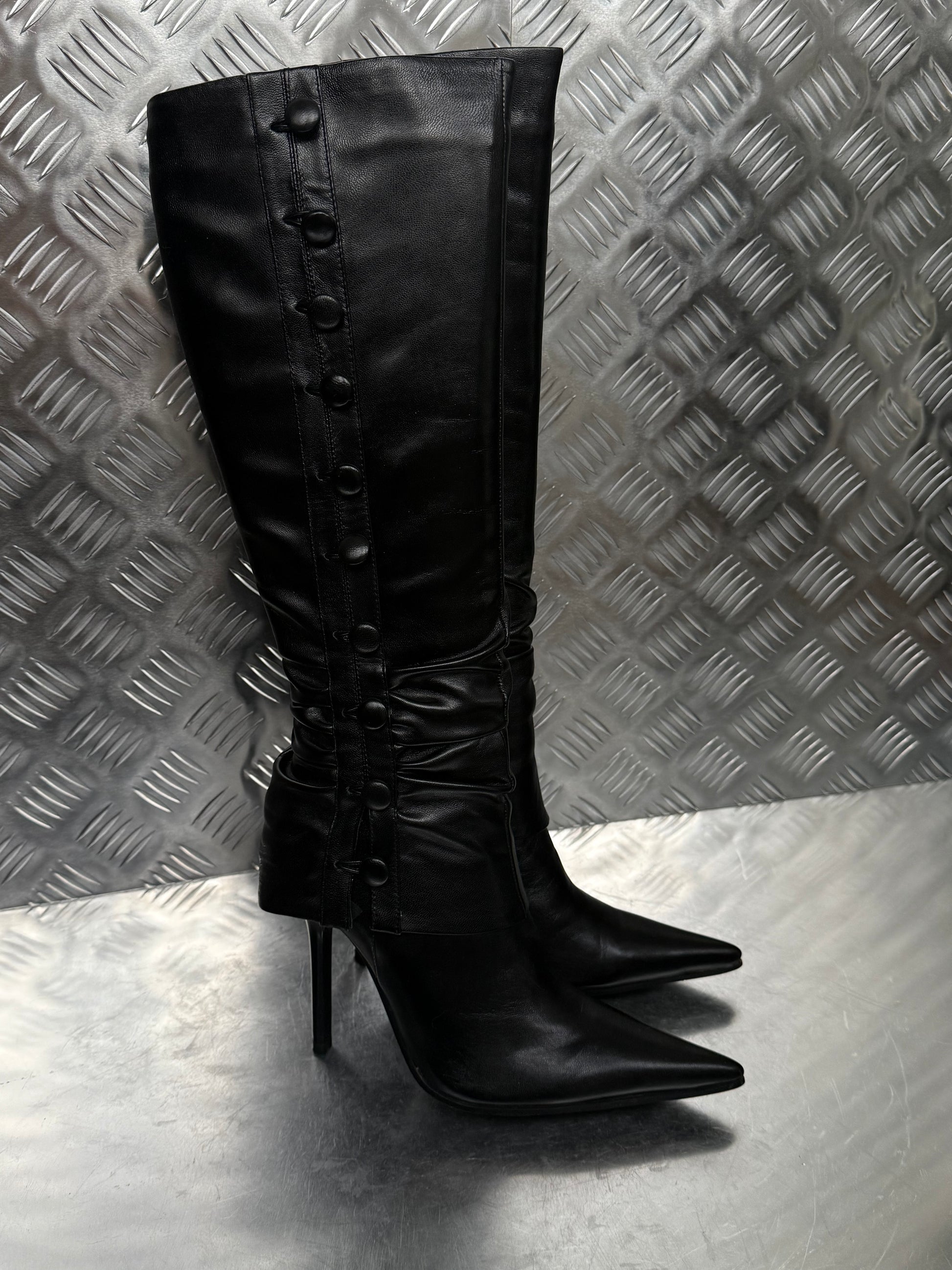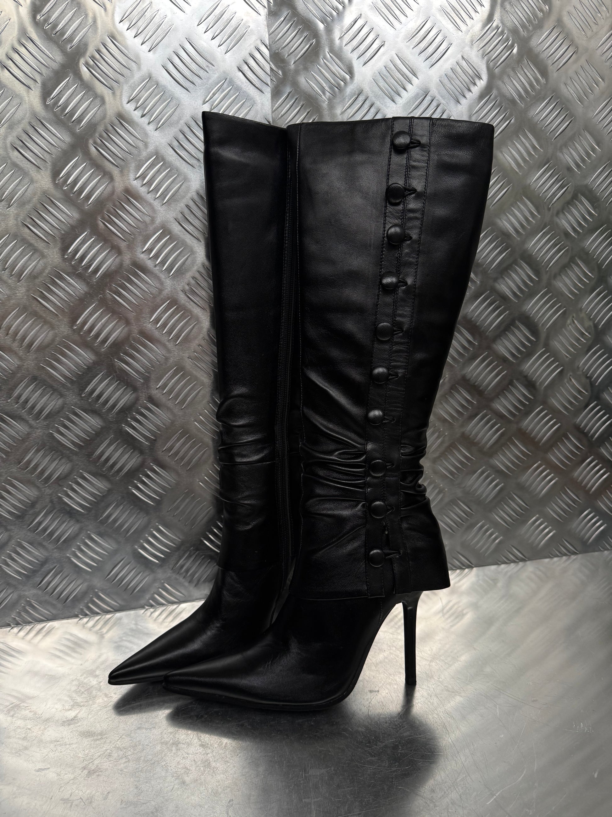 Vintage tall black leather boots with a sharp pointed toe and sleek stiletto heel. Elegant gathered leather detail along the side with covered button accents — refined and striking silhouette. Perfect structure, clean leather, and exceptionally well-preserved. Excellent condition.