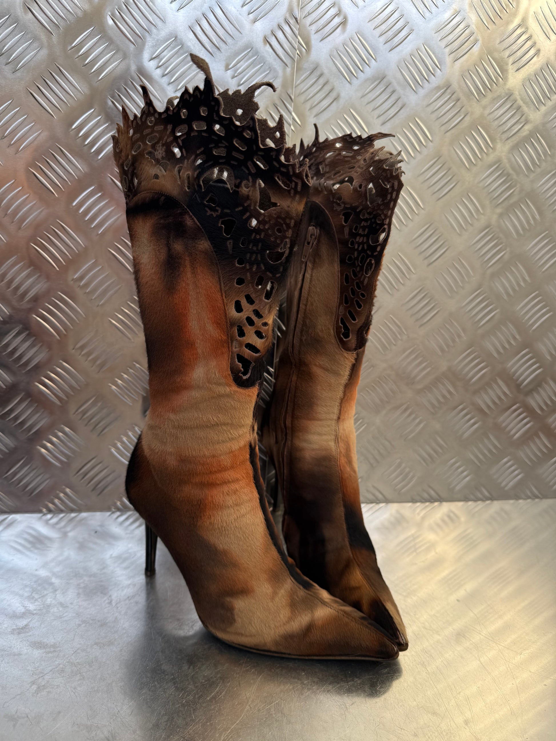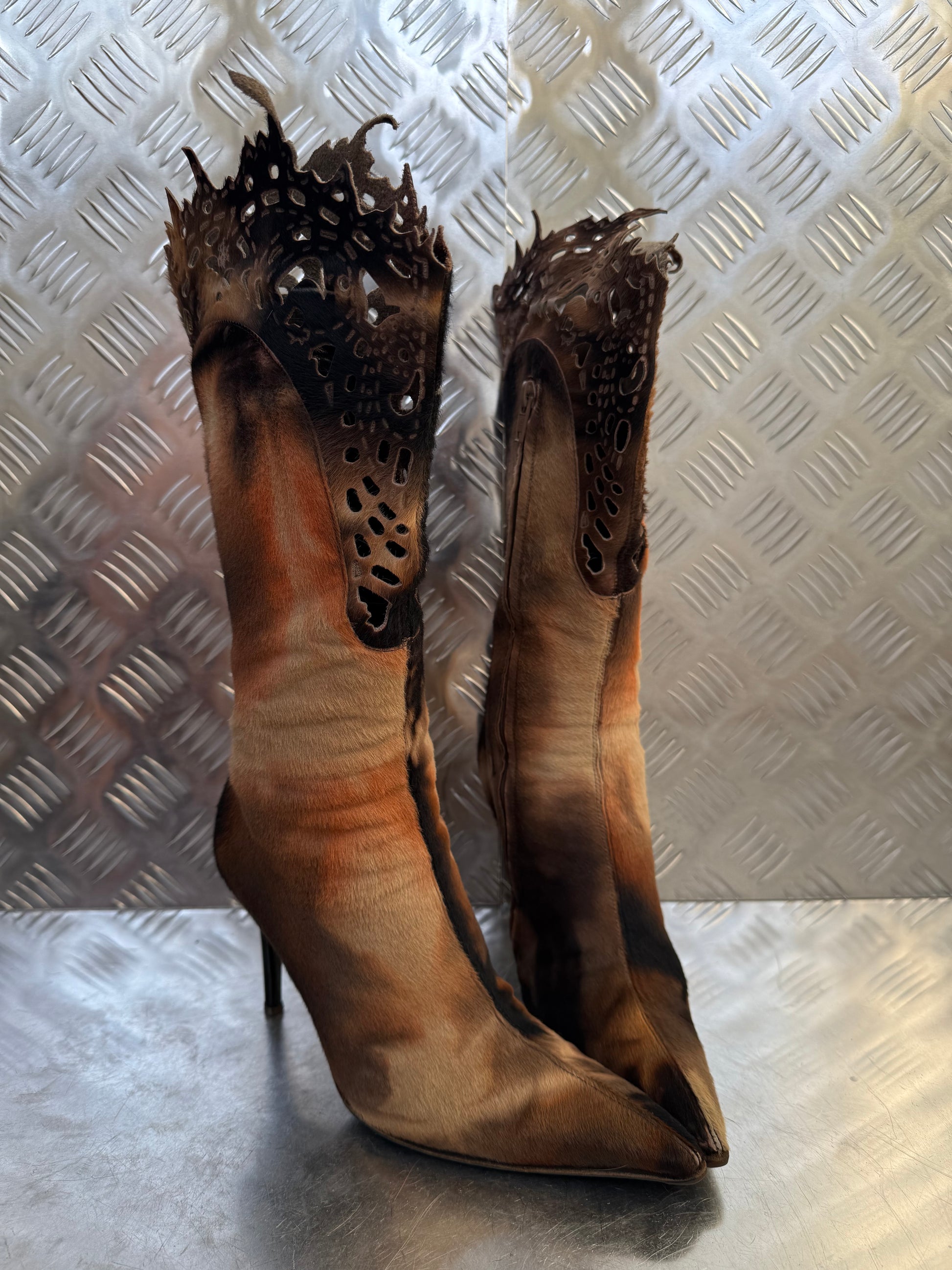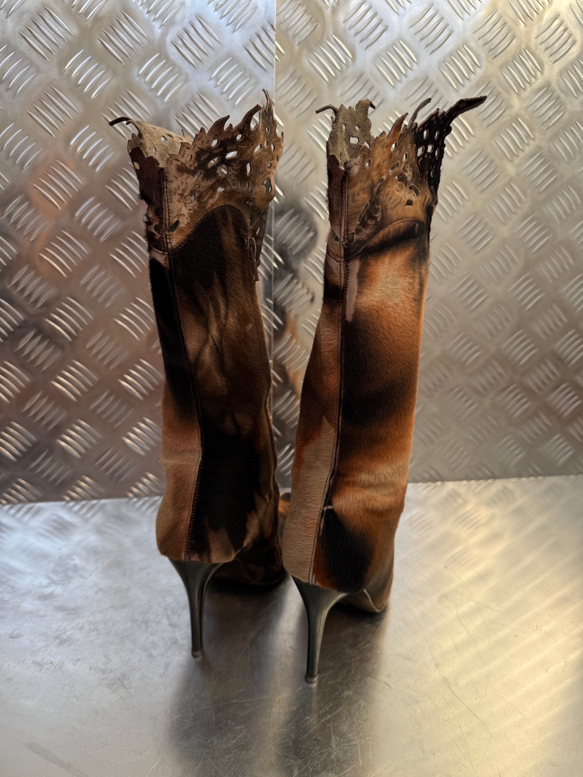 Vintage Italian boots crafted from leather with a pony-hair (calf hair) upper. Dramatic cut-out collar and sharp pointed toe on a slim stiletto heel. Condition is satisfactory: visible wear/thinning on the pony-hair areas — please review photos carefully.