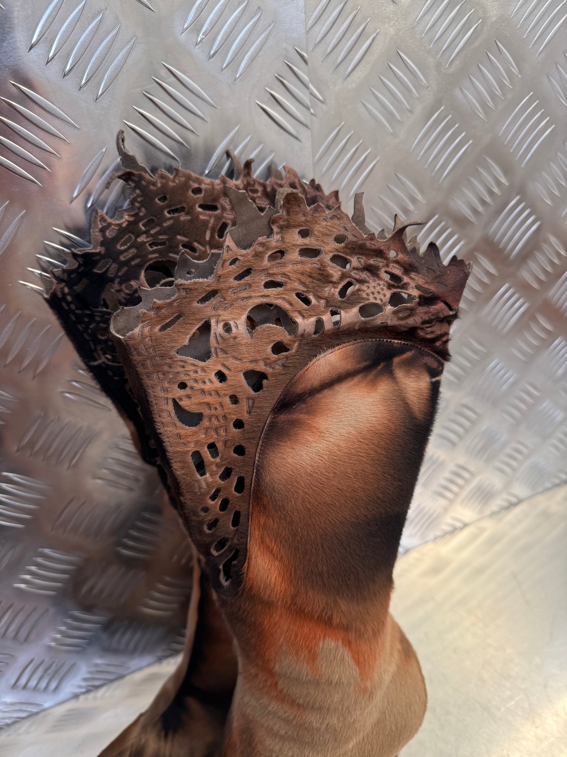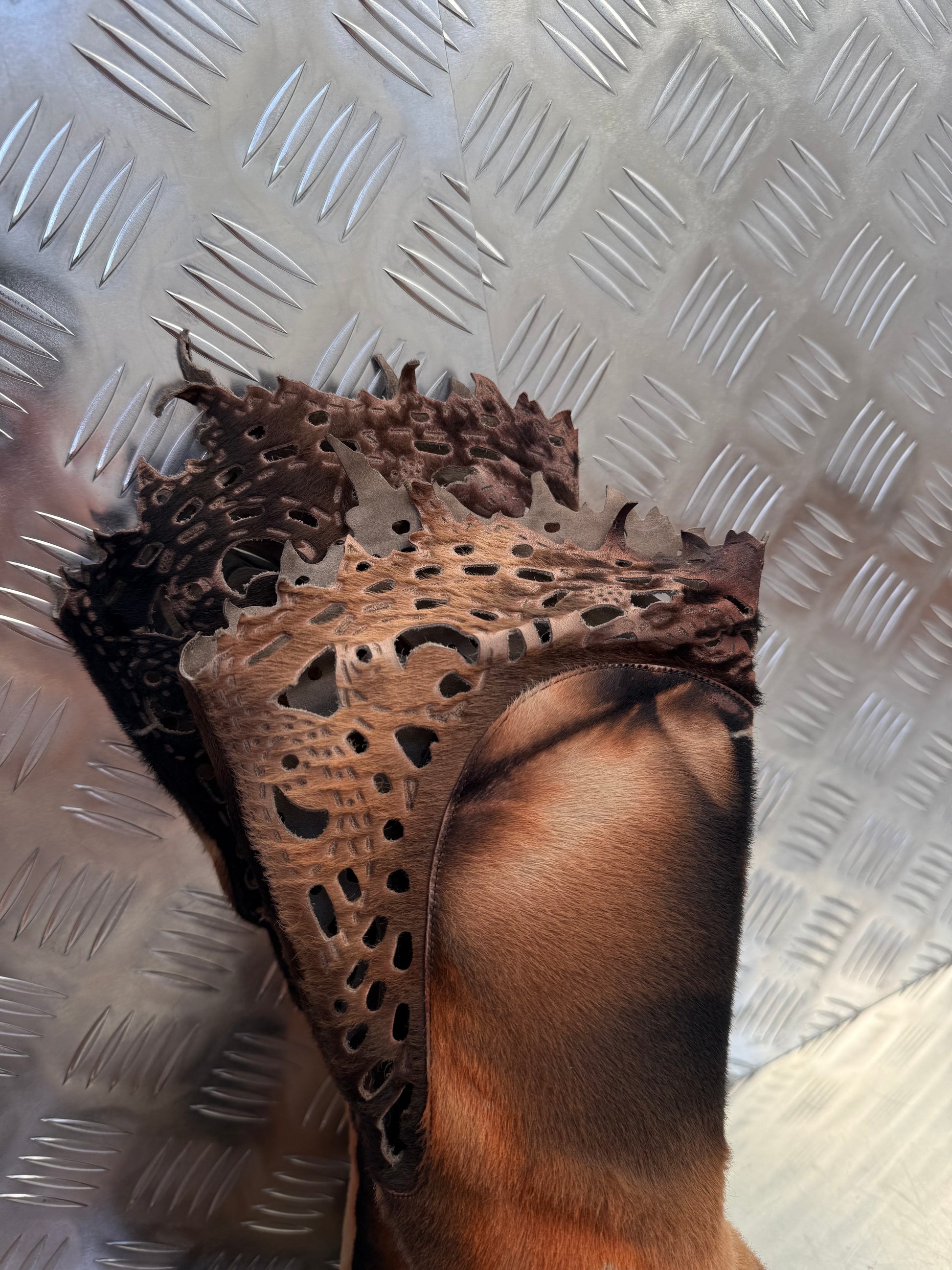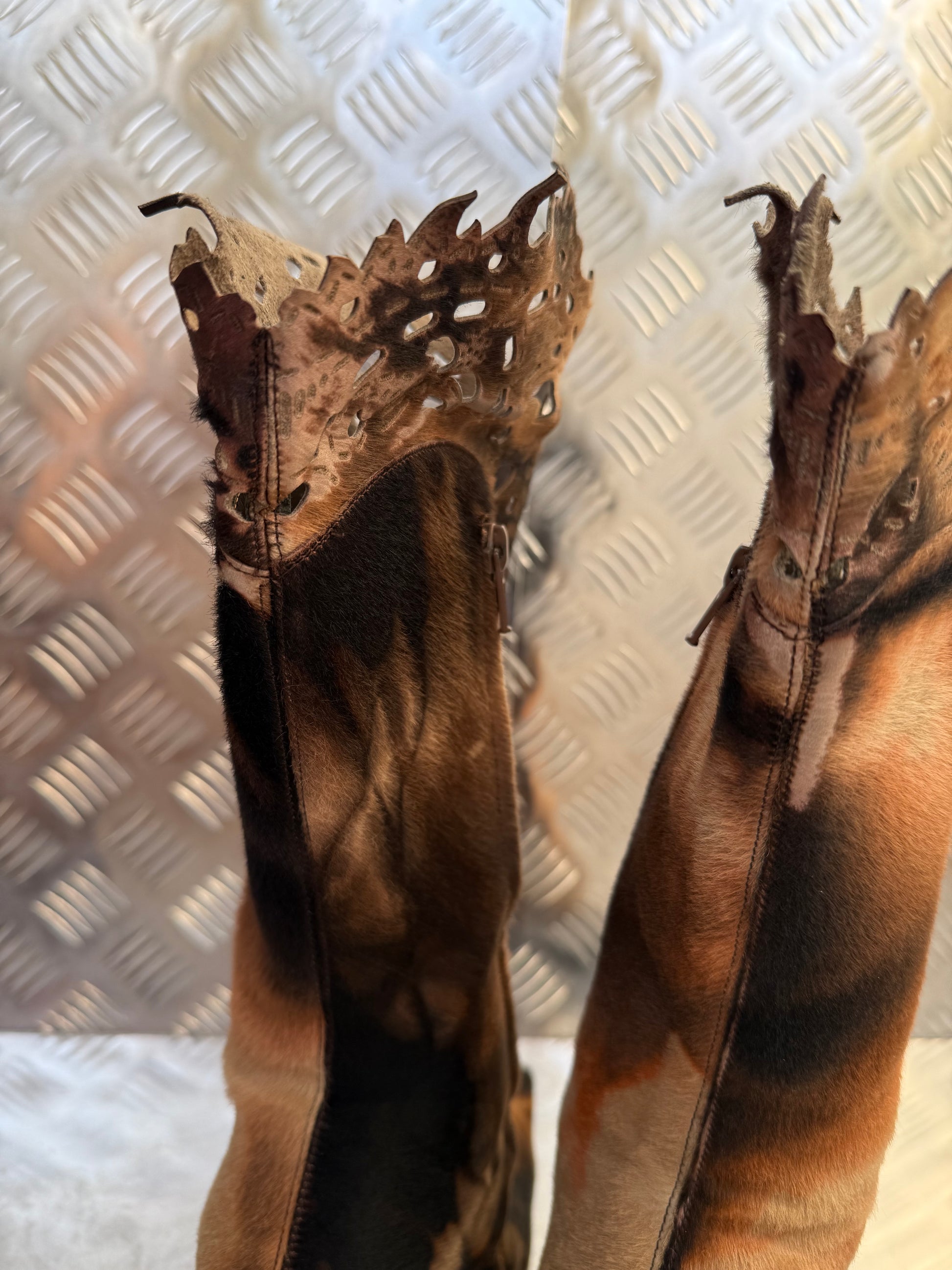 Vintage Italian boots crafted from leather with a pony-hair (calf hair) upper. Dramatic cut-out collar and sharp pointed toe on a slim stiletto heel. Condition is satisfactory: visible wear/thinning on the pony-hair areas — please review photos carefully.