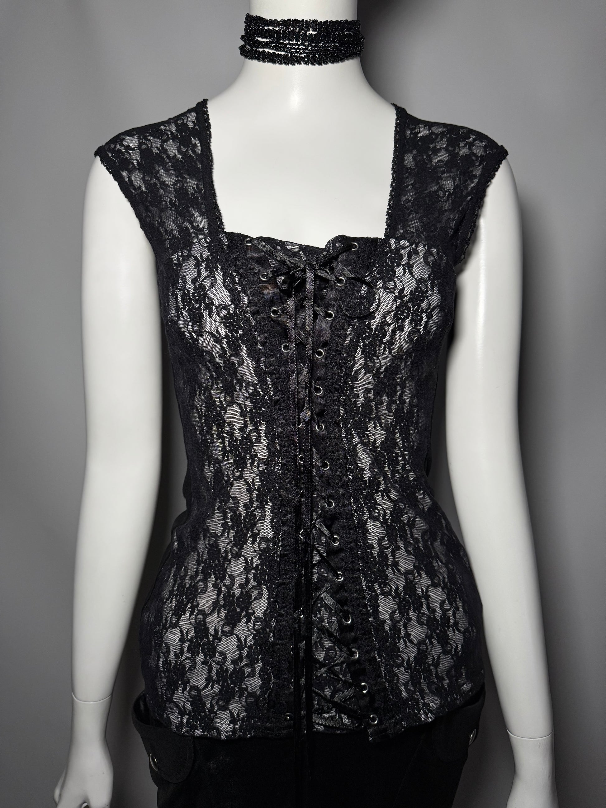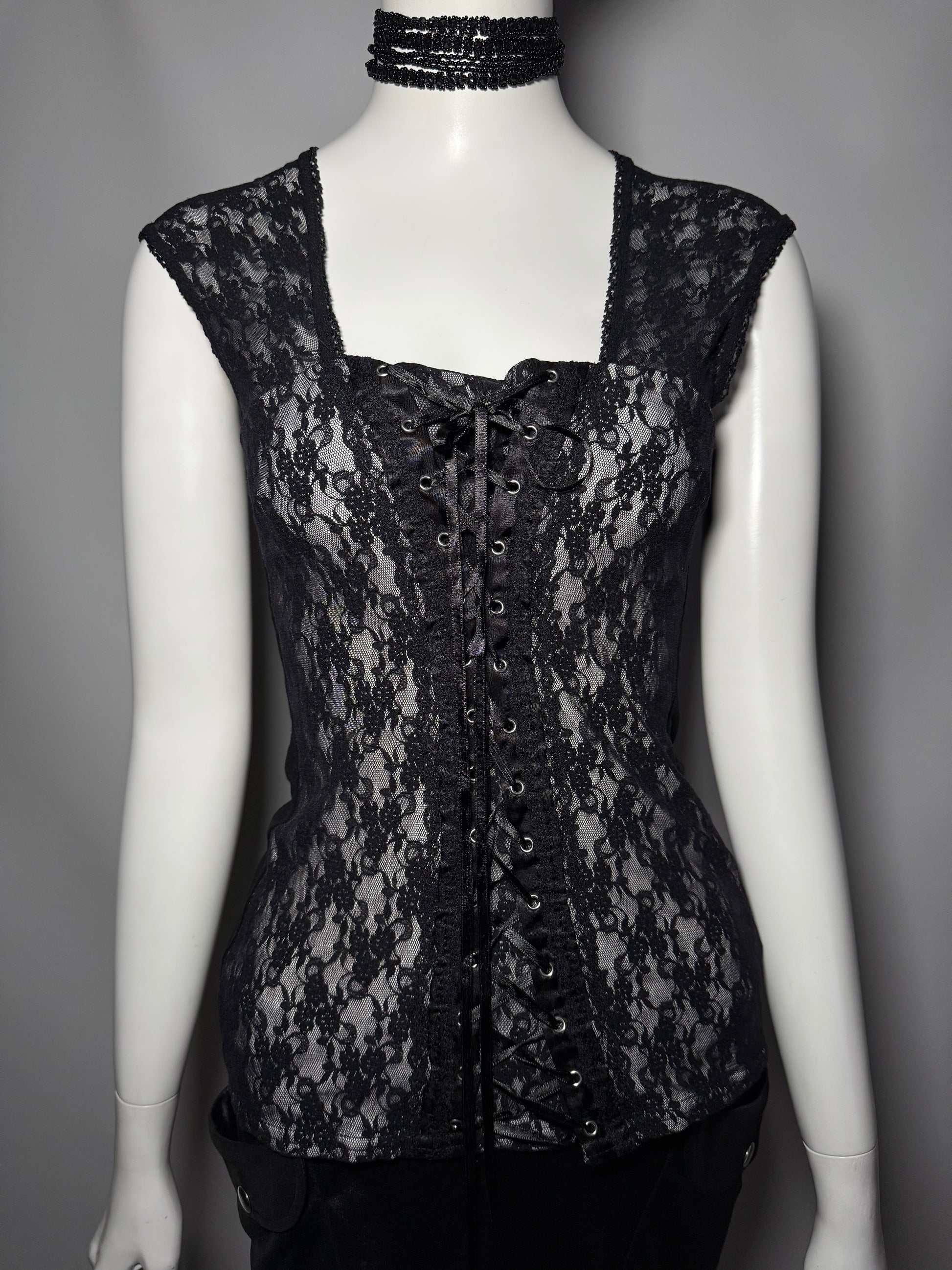 Gothic Black Lace Corset-Style Top with Front Lacing Twinkling