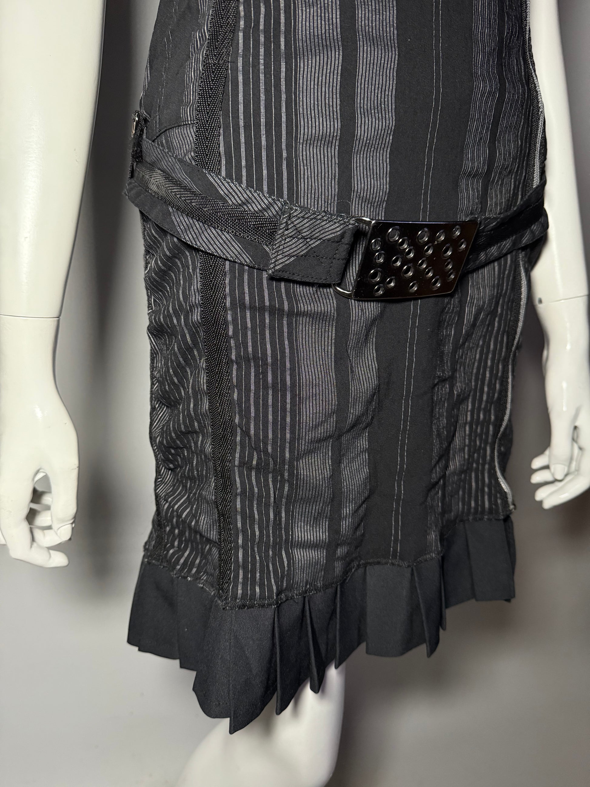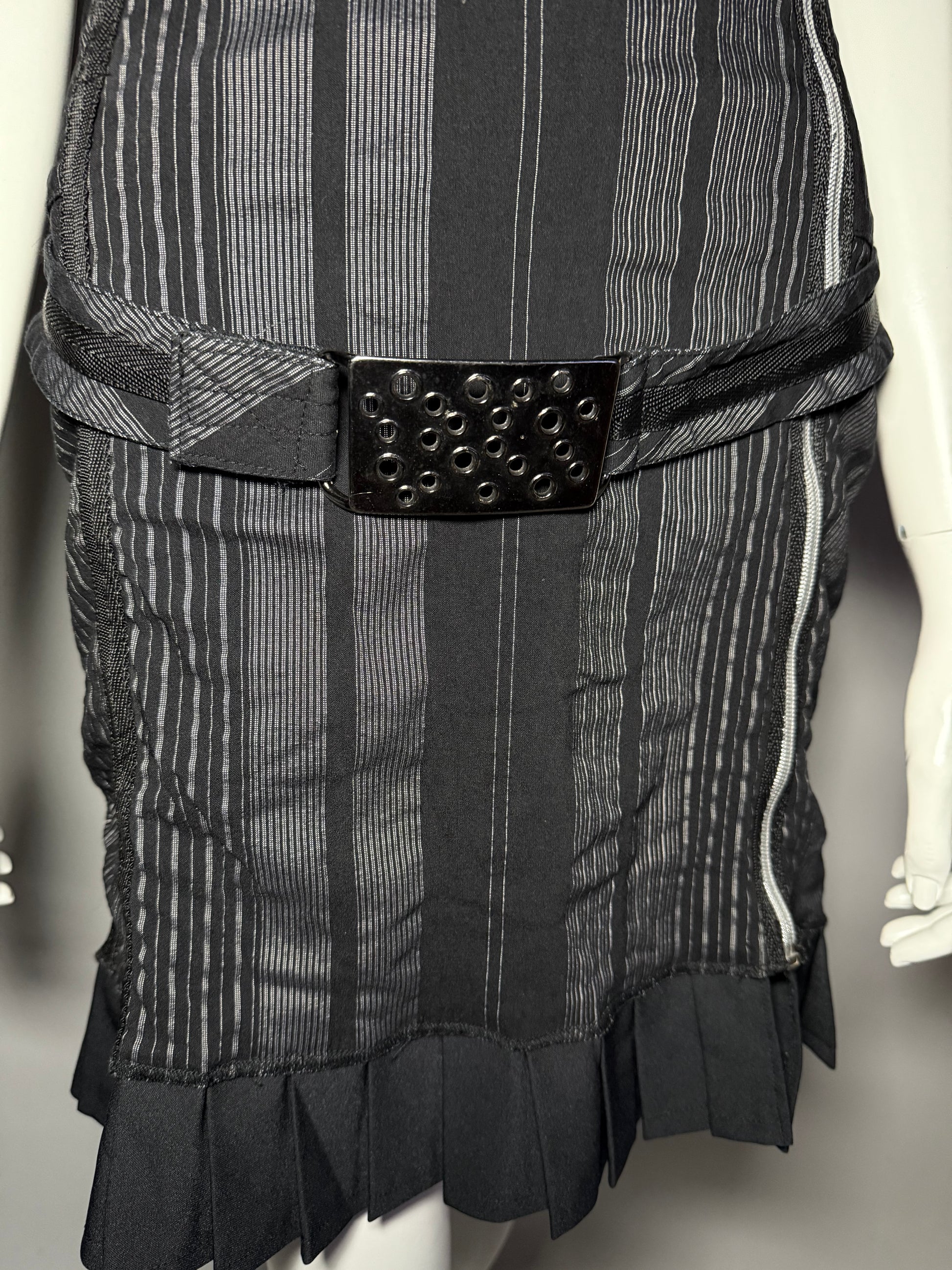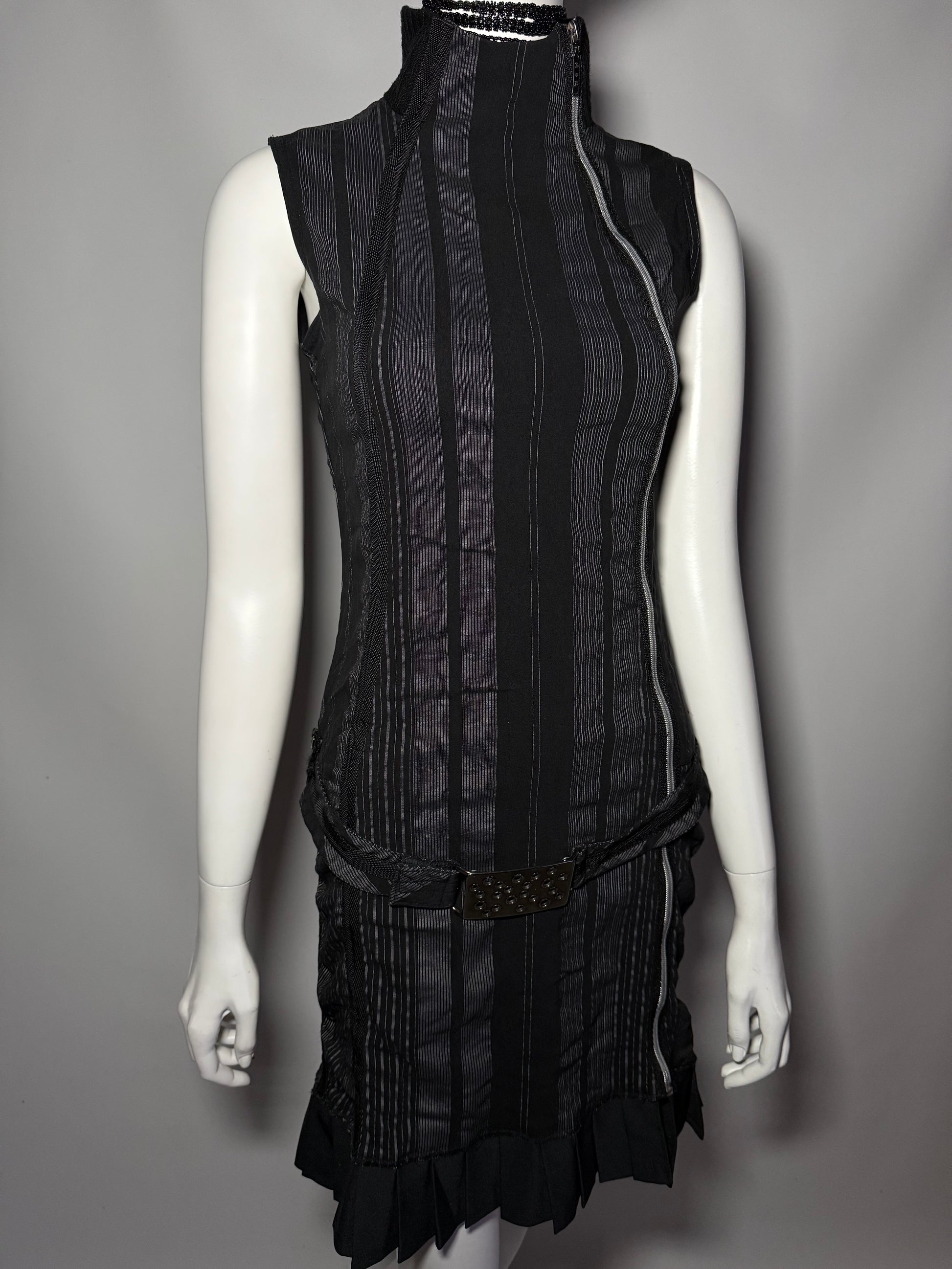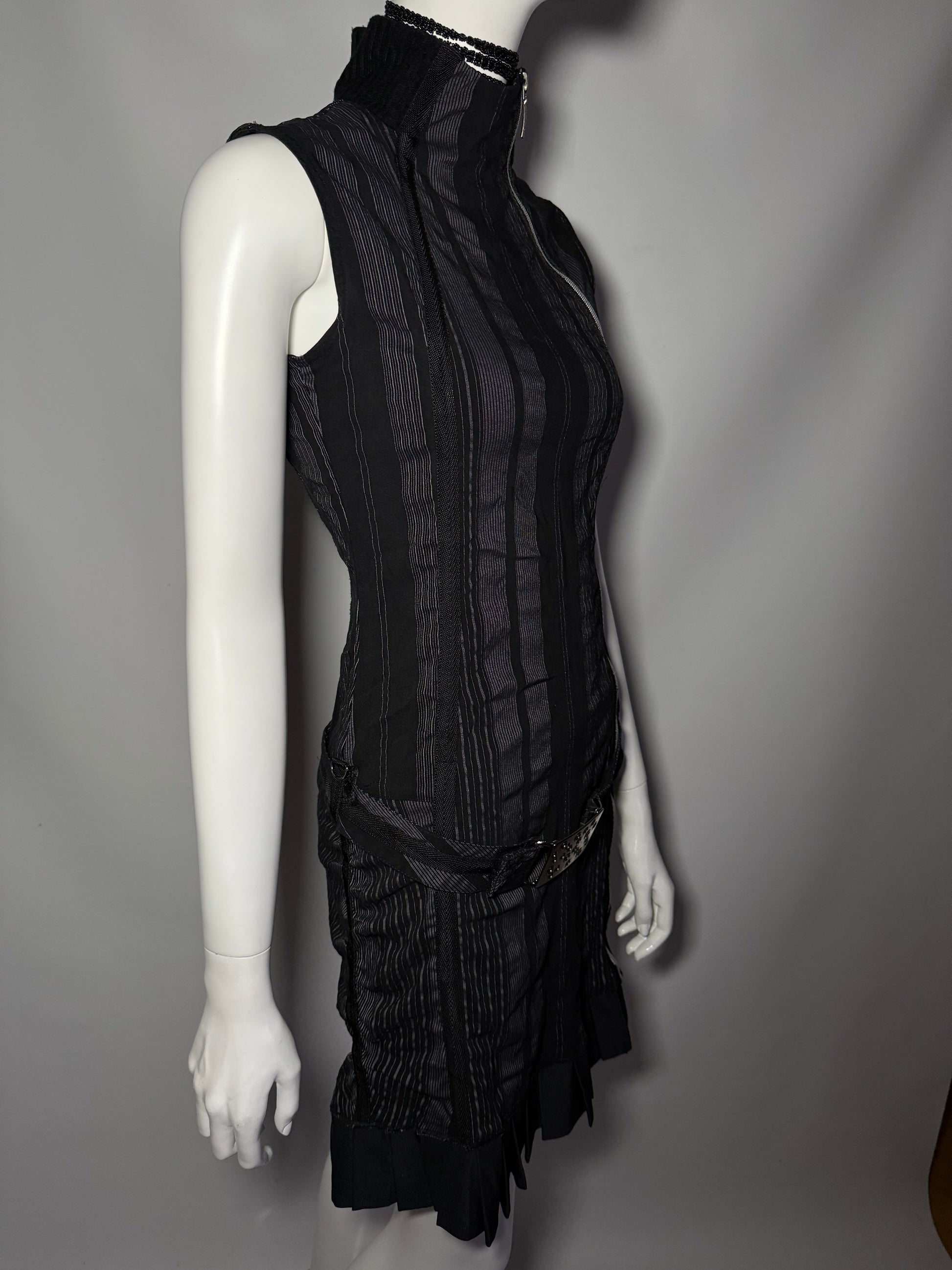 Gothic Y2K high-neck striped dress with belt and pleated hem.