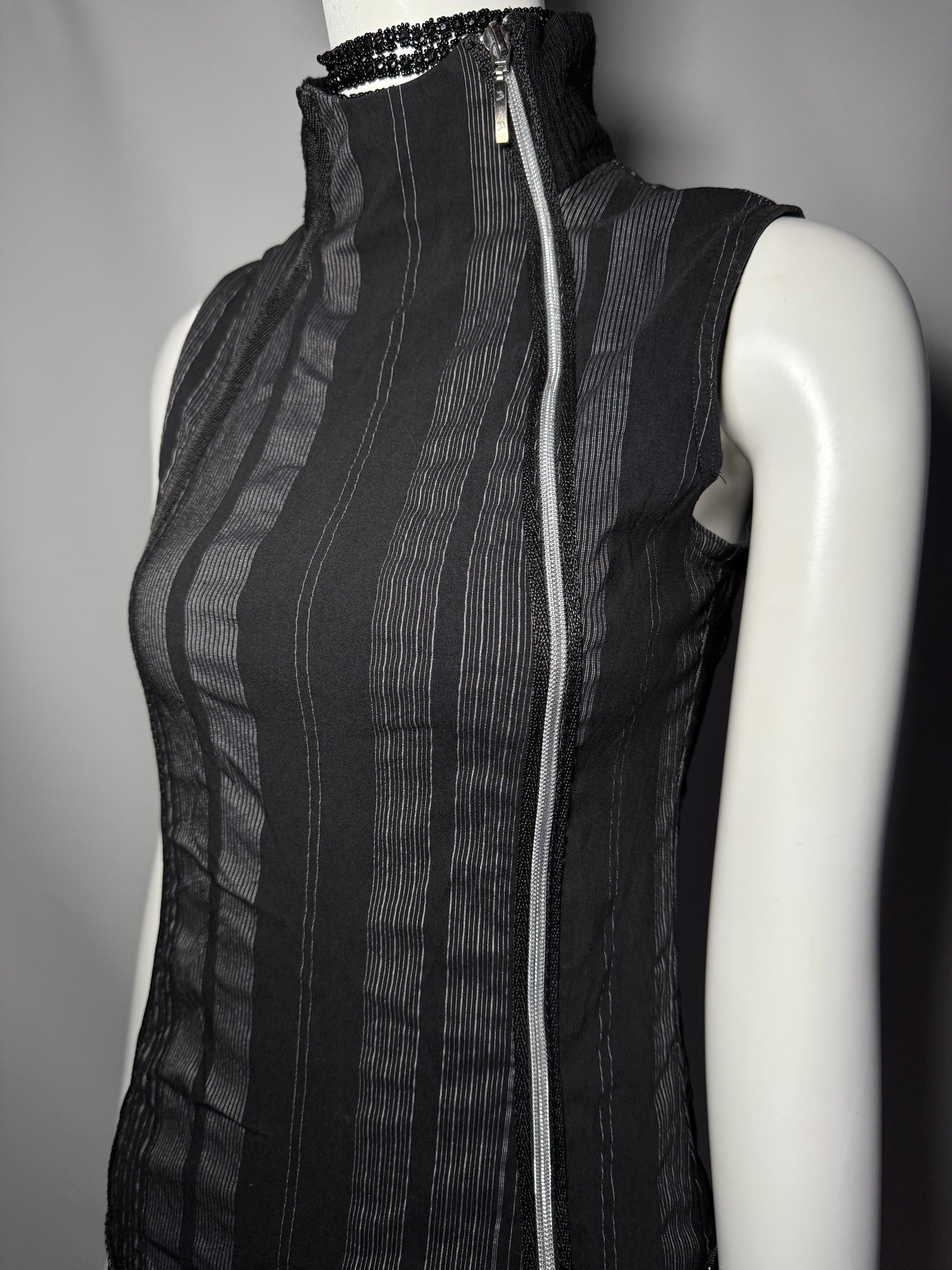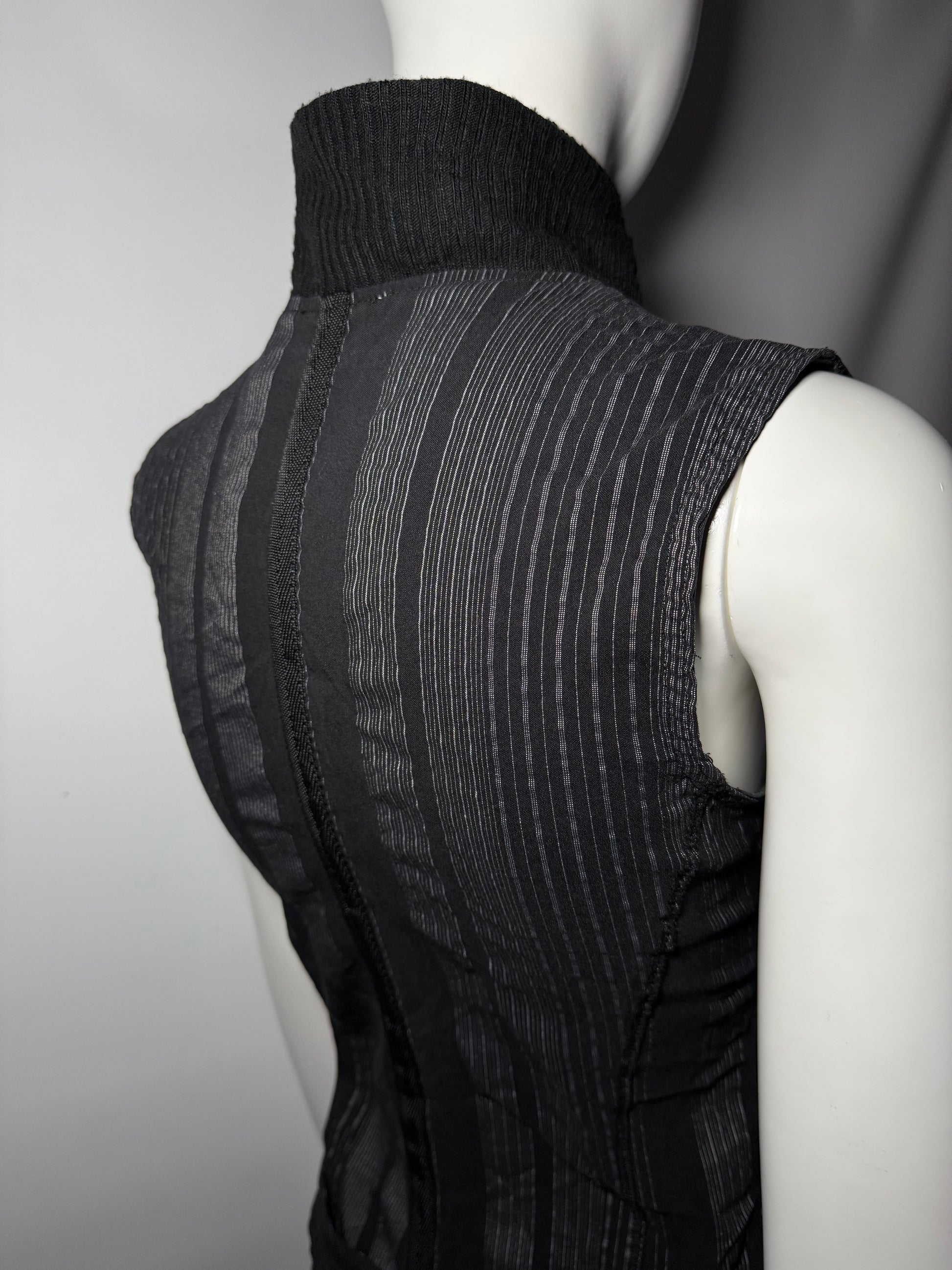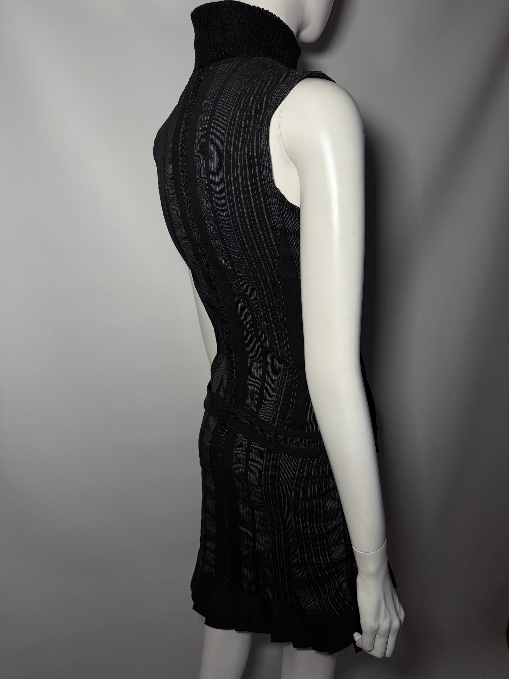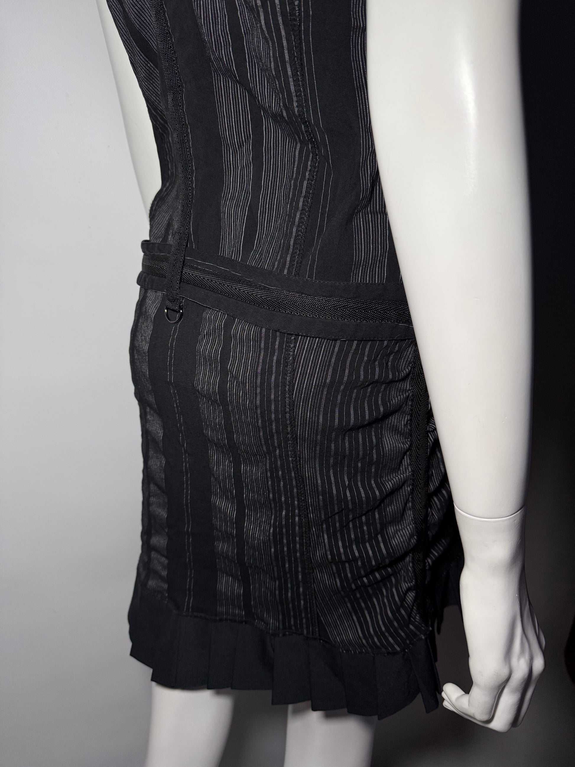 Gothic Y2K high-neck striped dress with belt and pleated hem.