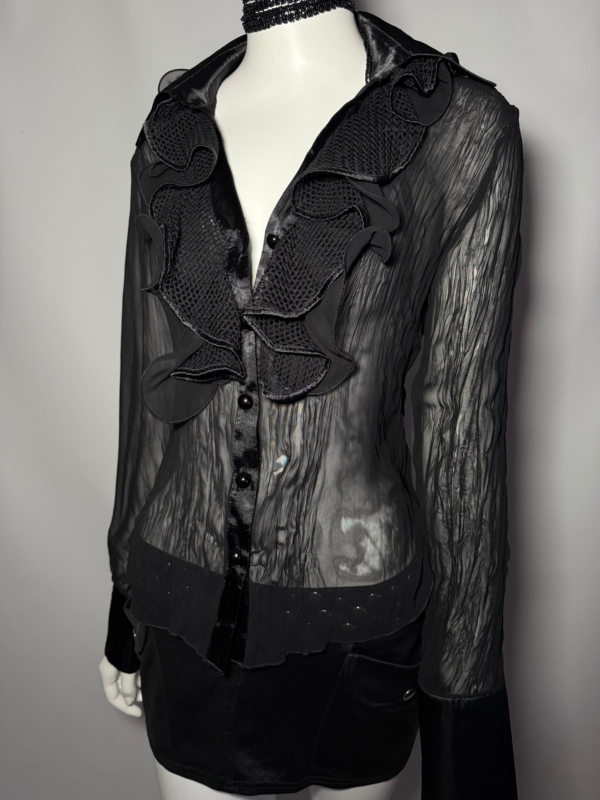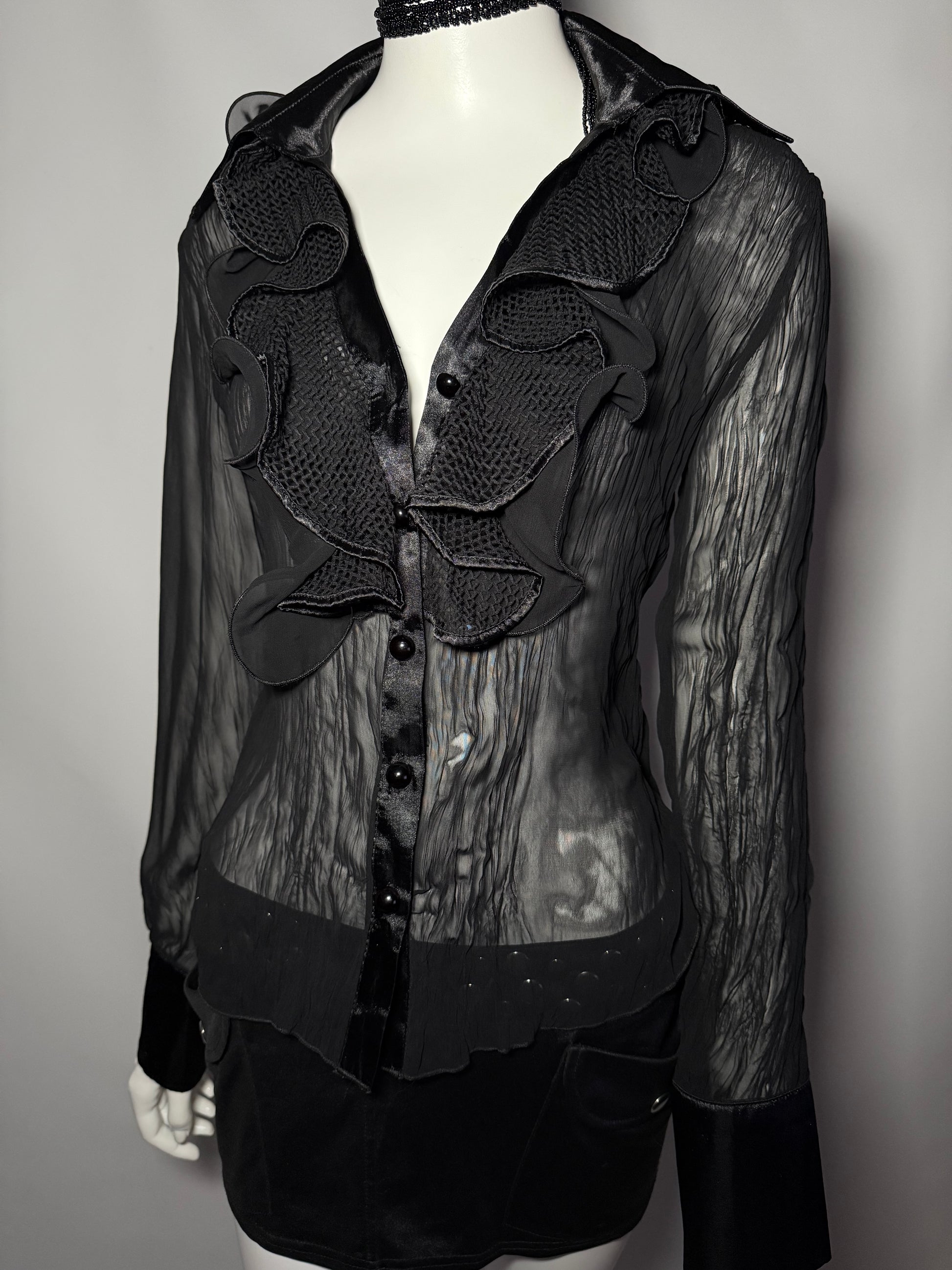 Elegant sheer black blouse with textured ruffles and satin button closure. Eye-catching collar and sculptural design.
