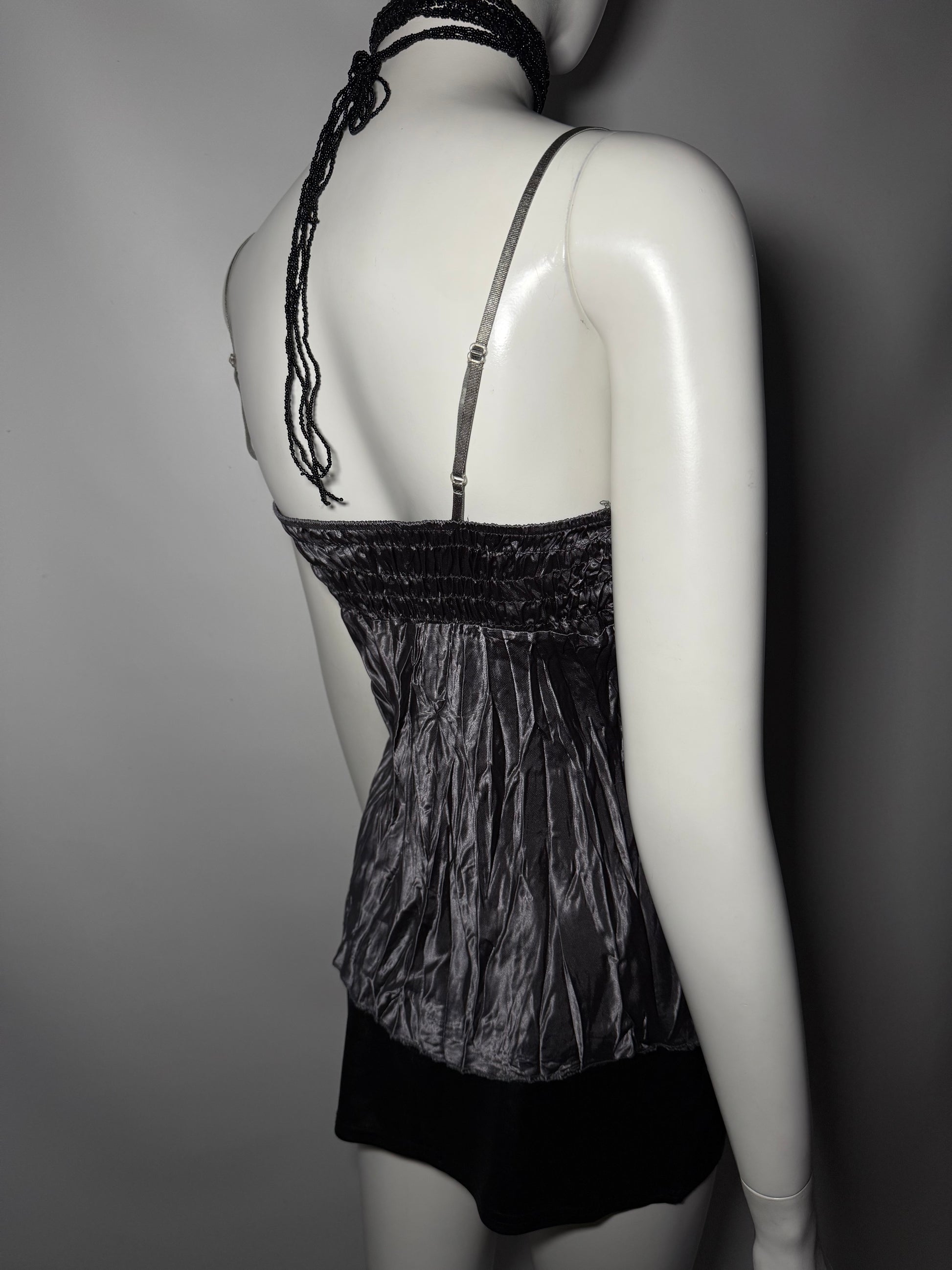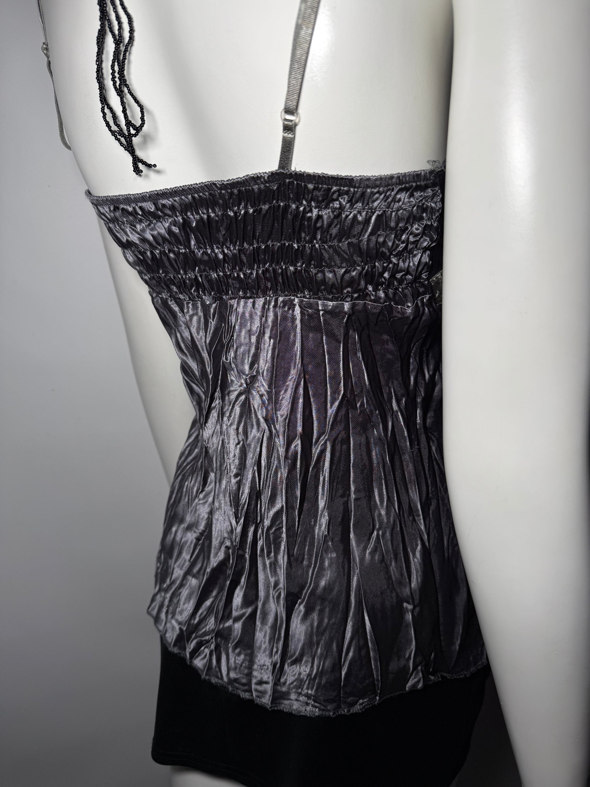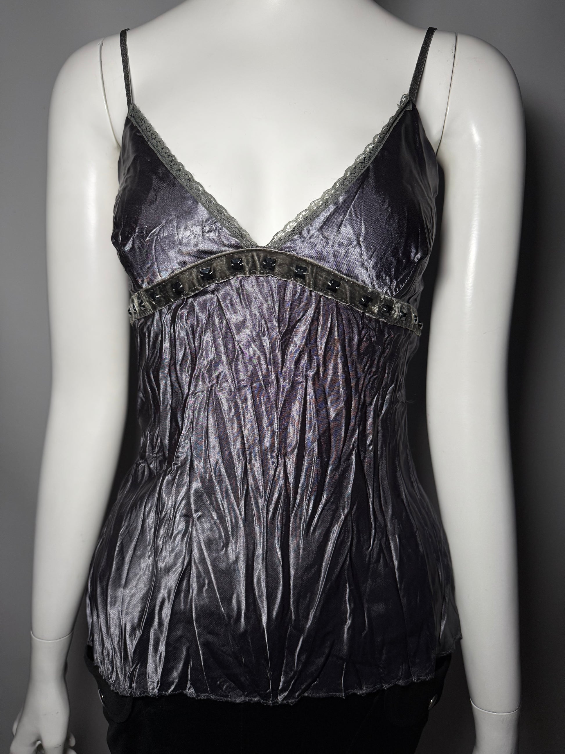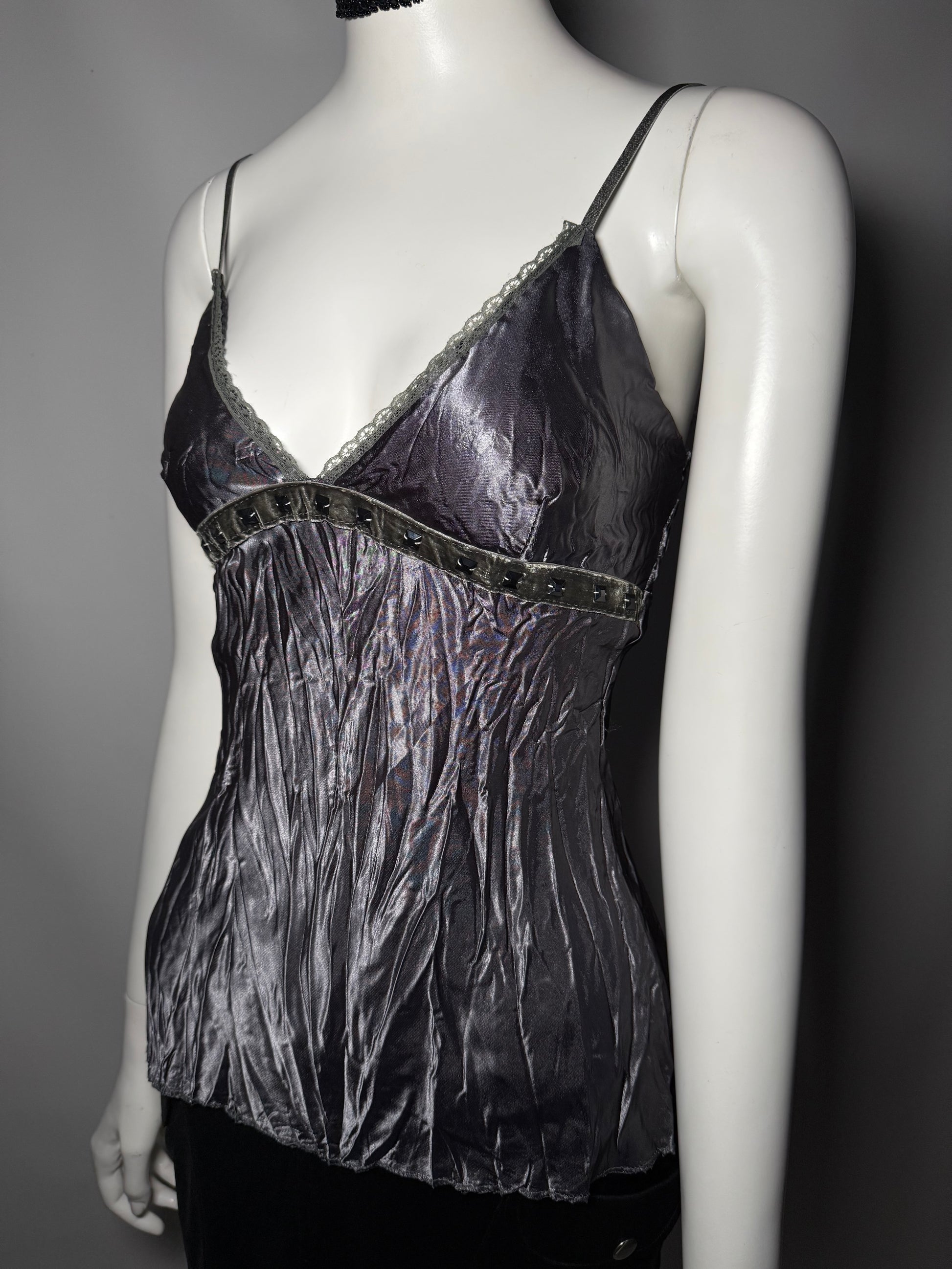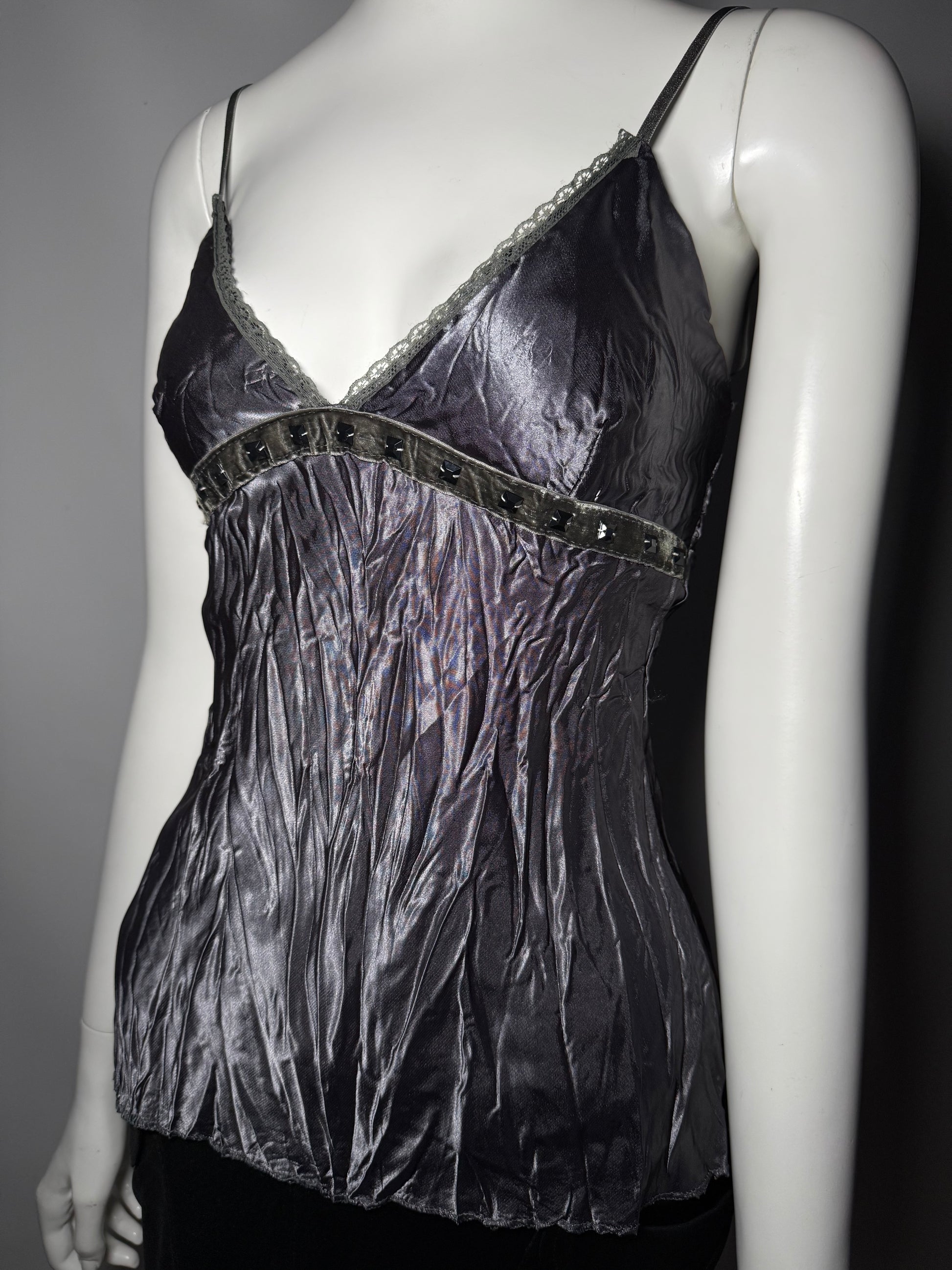 Italian-made shiny crinkled camisole with thin straps and a unique decorative trim under the bust. Elegant, soft, and lightly fitted.