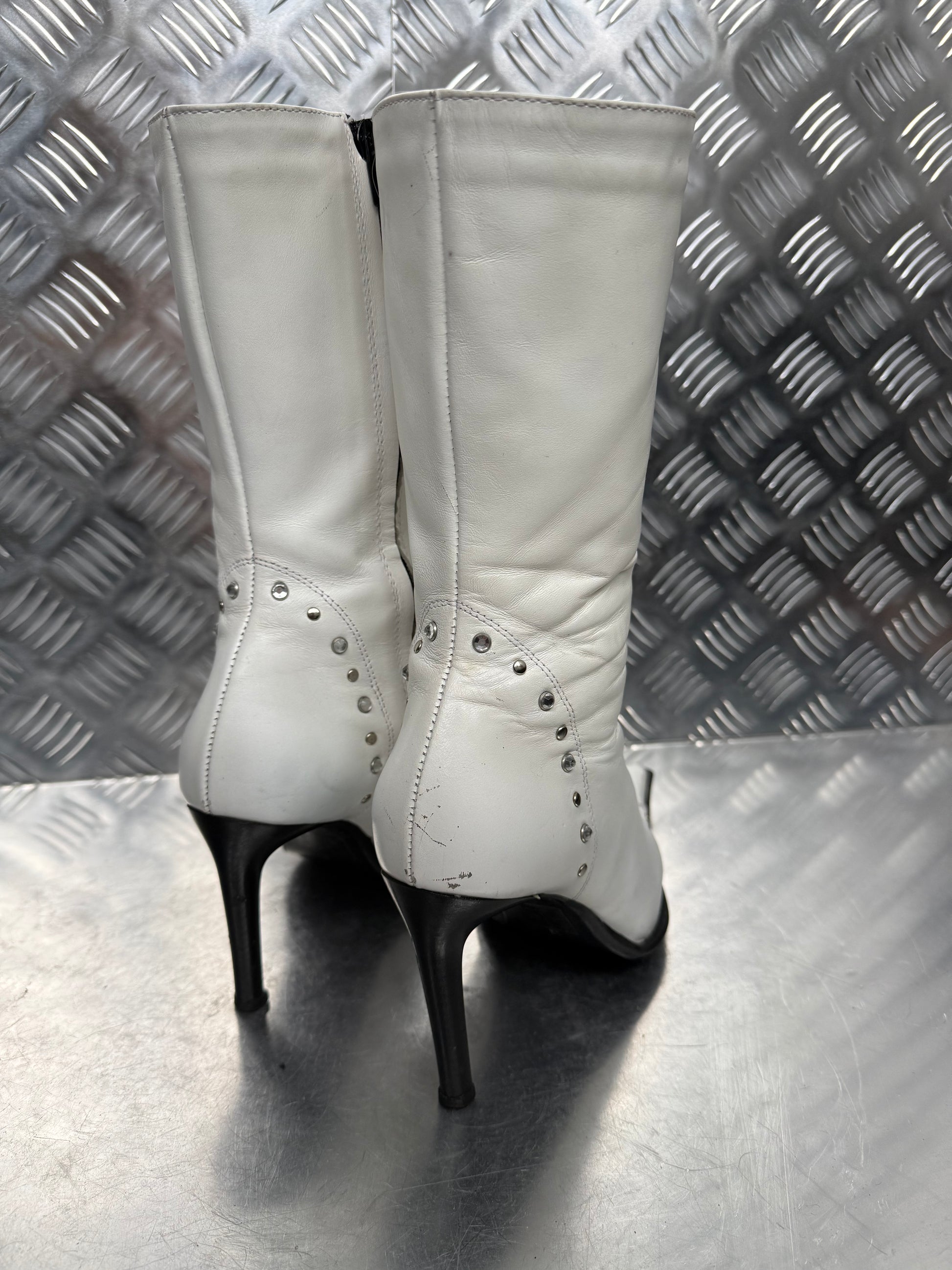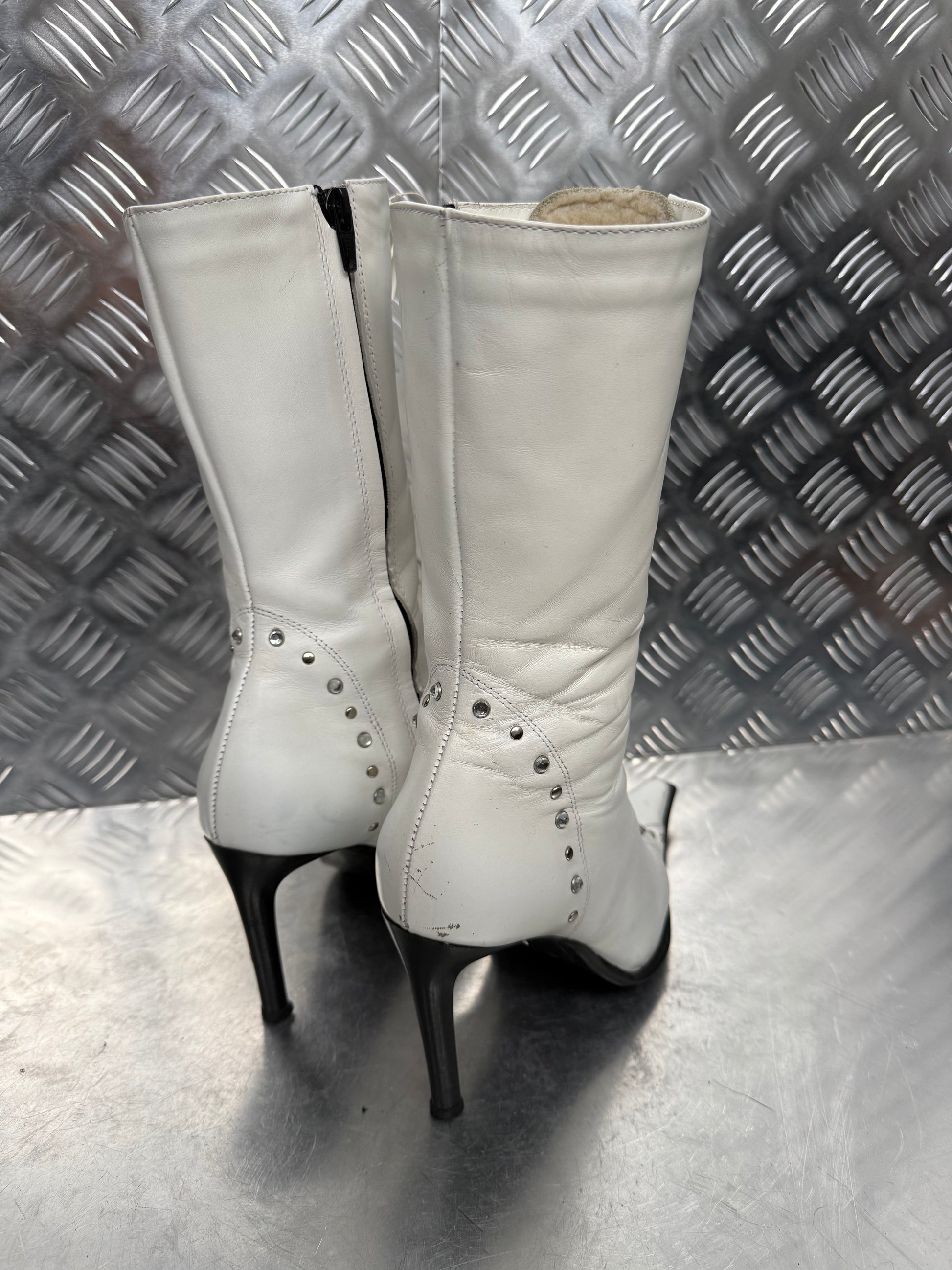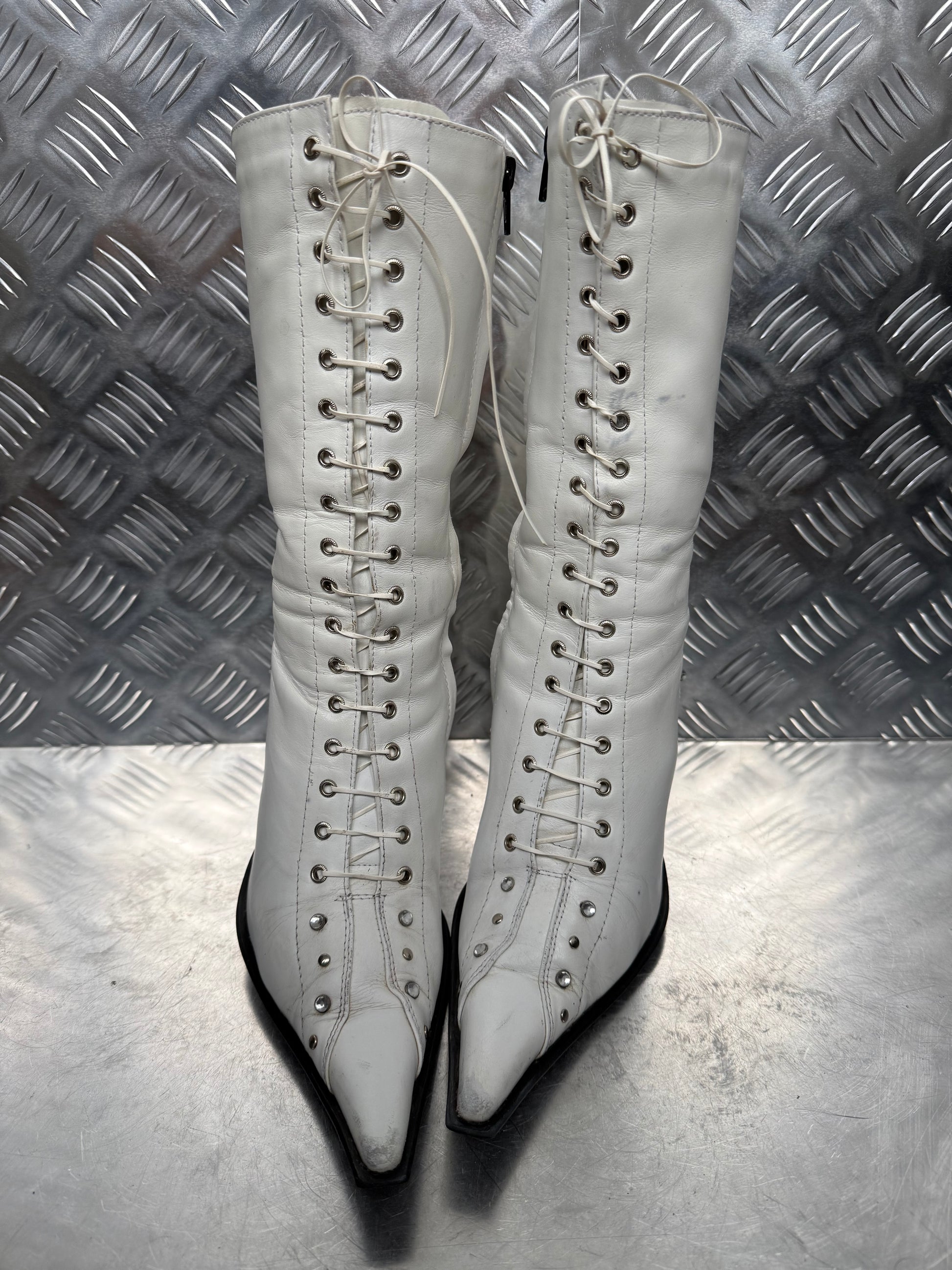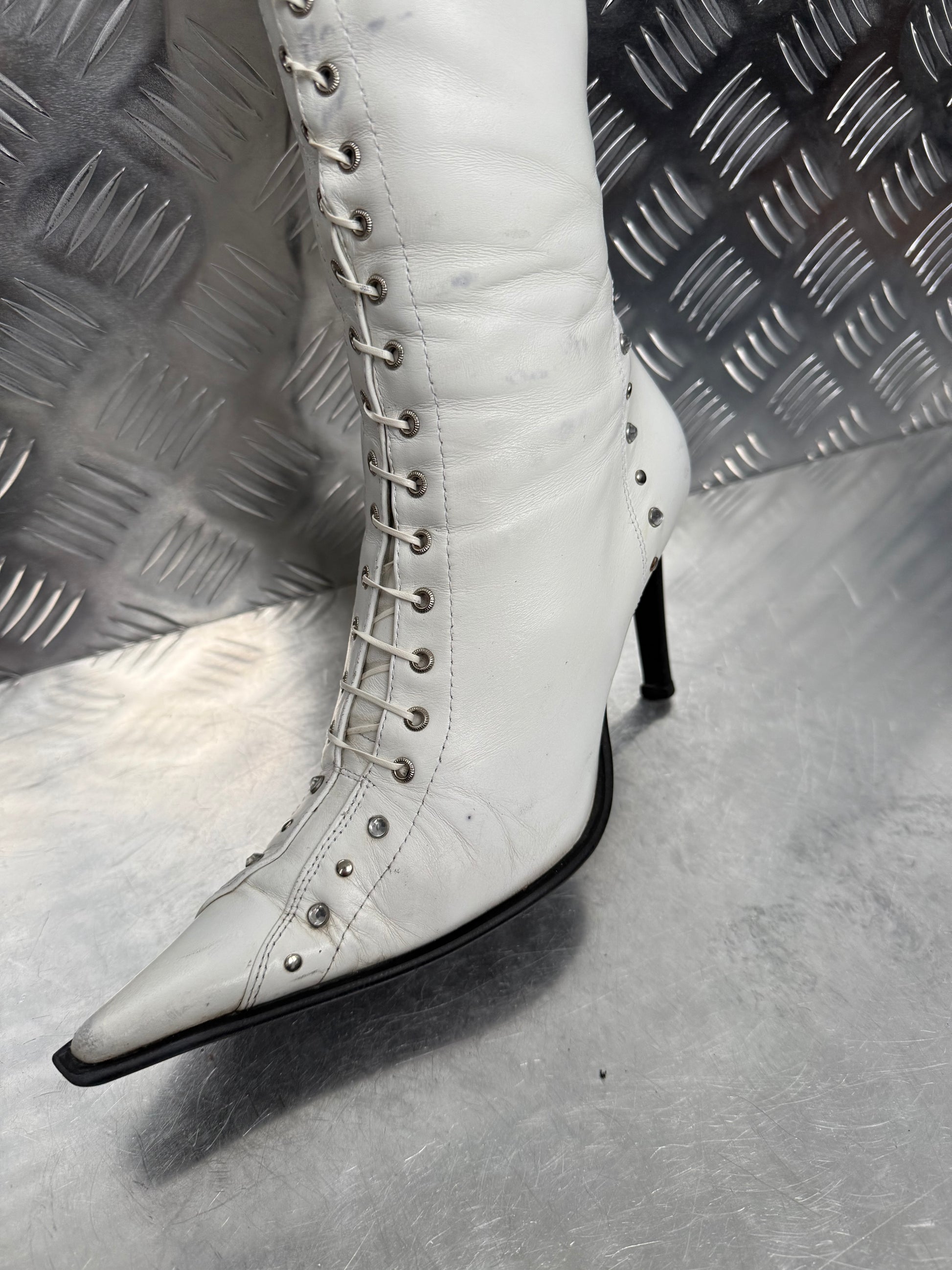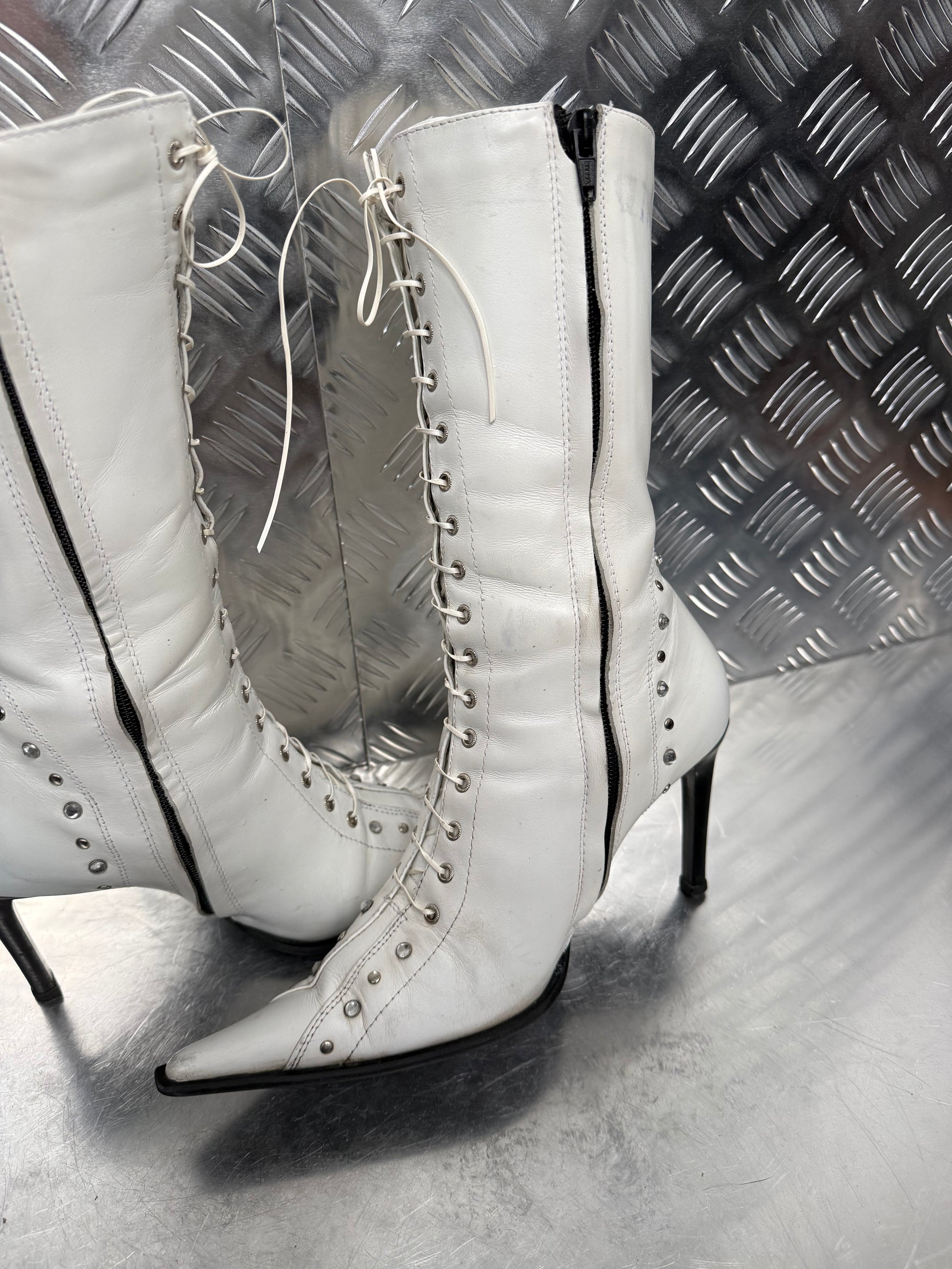 Vintage white leather lace-up boots with metal eyelets, pointed toe and side zip. Sleek silhouette with stiletto heel. Condition with signs of wear — visible creases, scuffs, and scratches (see all photos).