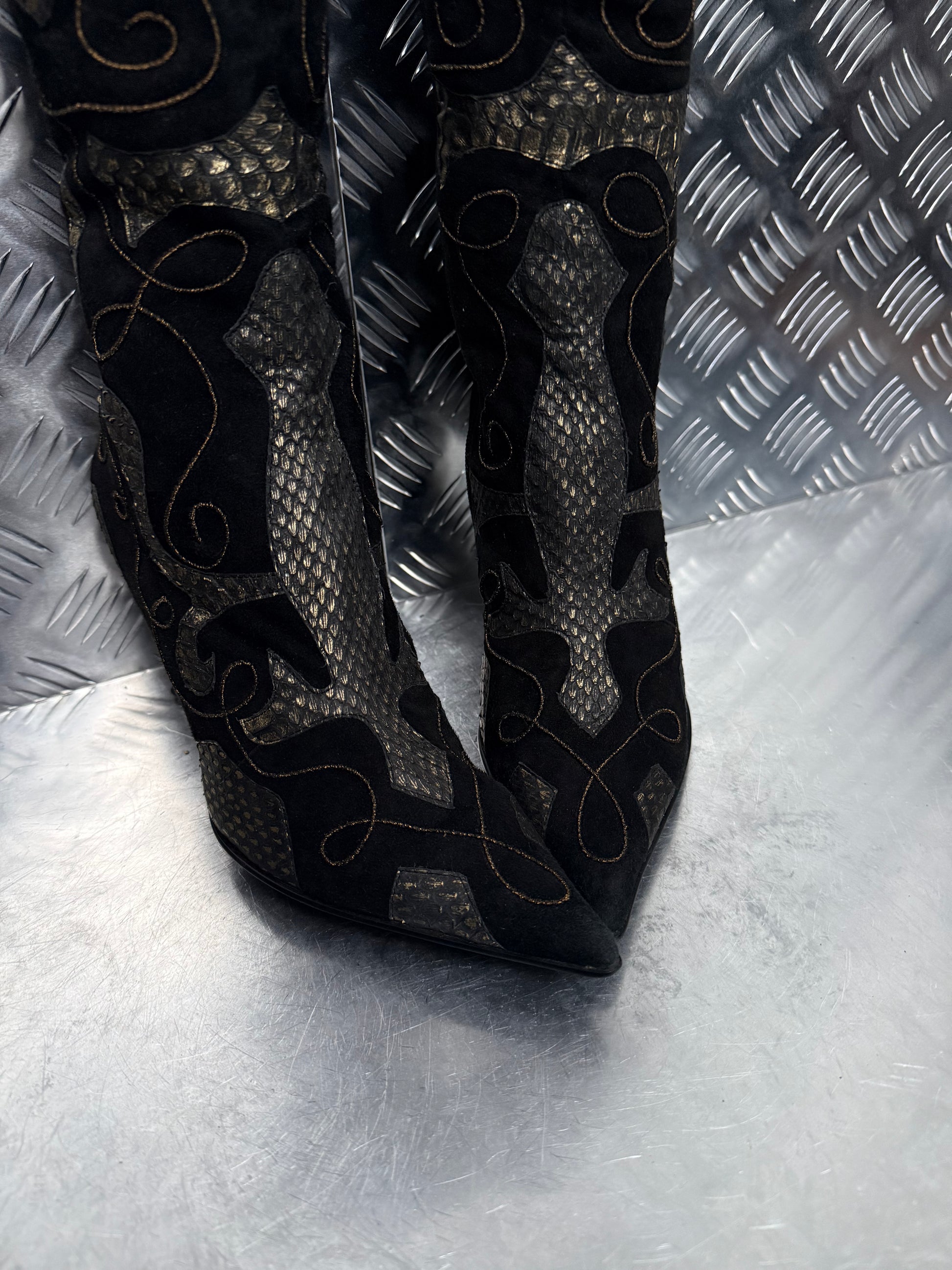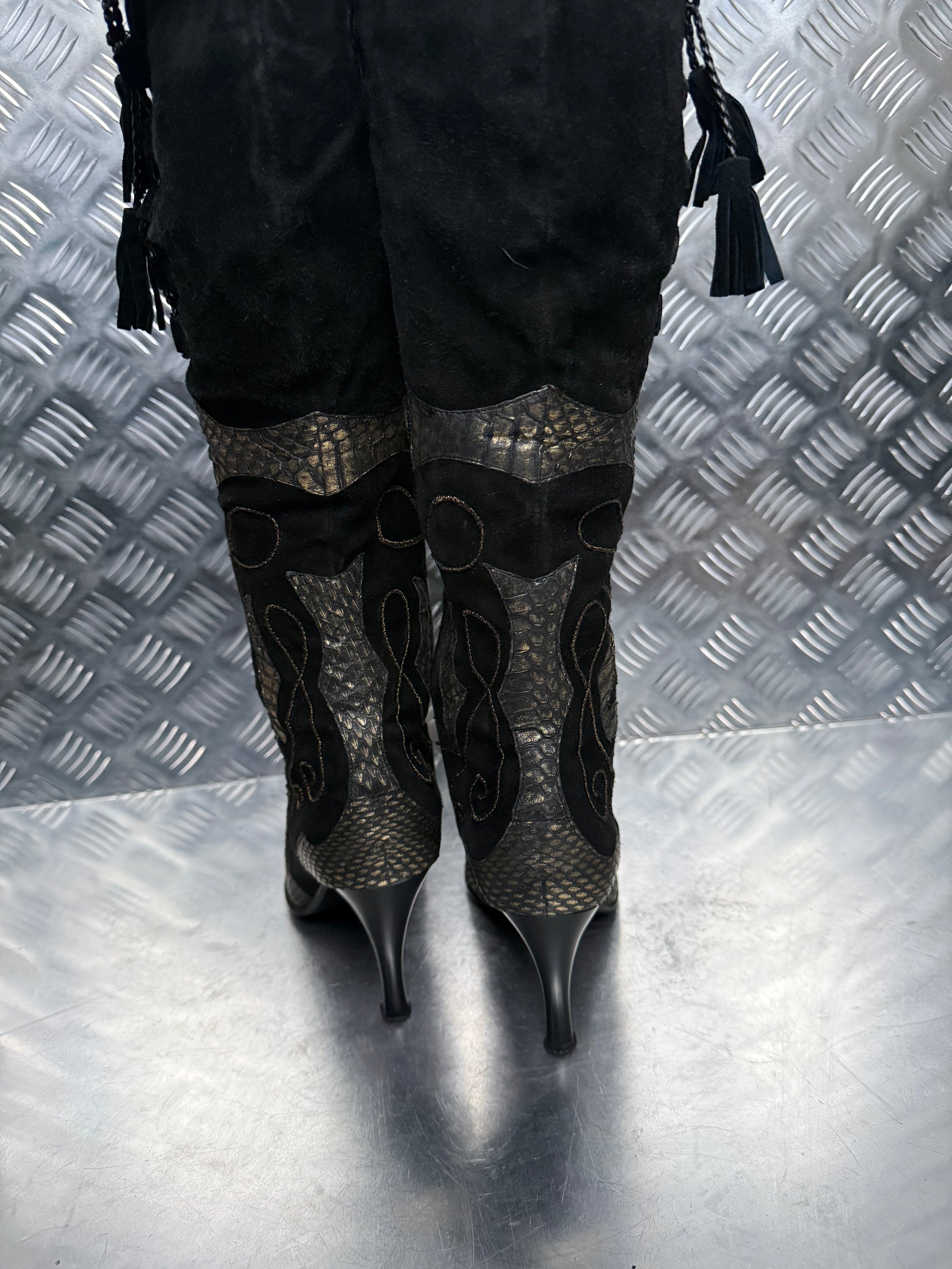 Vintage black suede boots with metallic textured inlays and decorative embroidery. Elegant pointed toe and stiletto heel, with tassel detail at the top. Side zip closure. Very good condition.