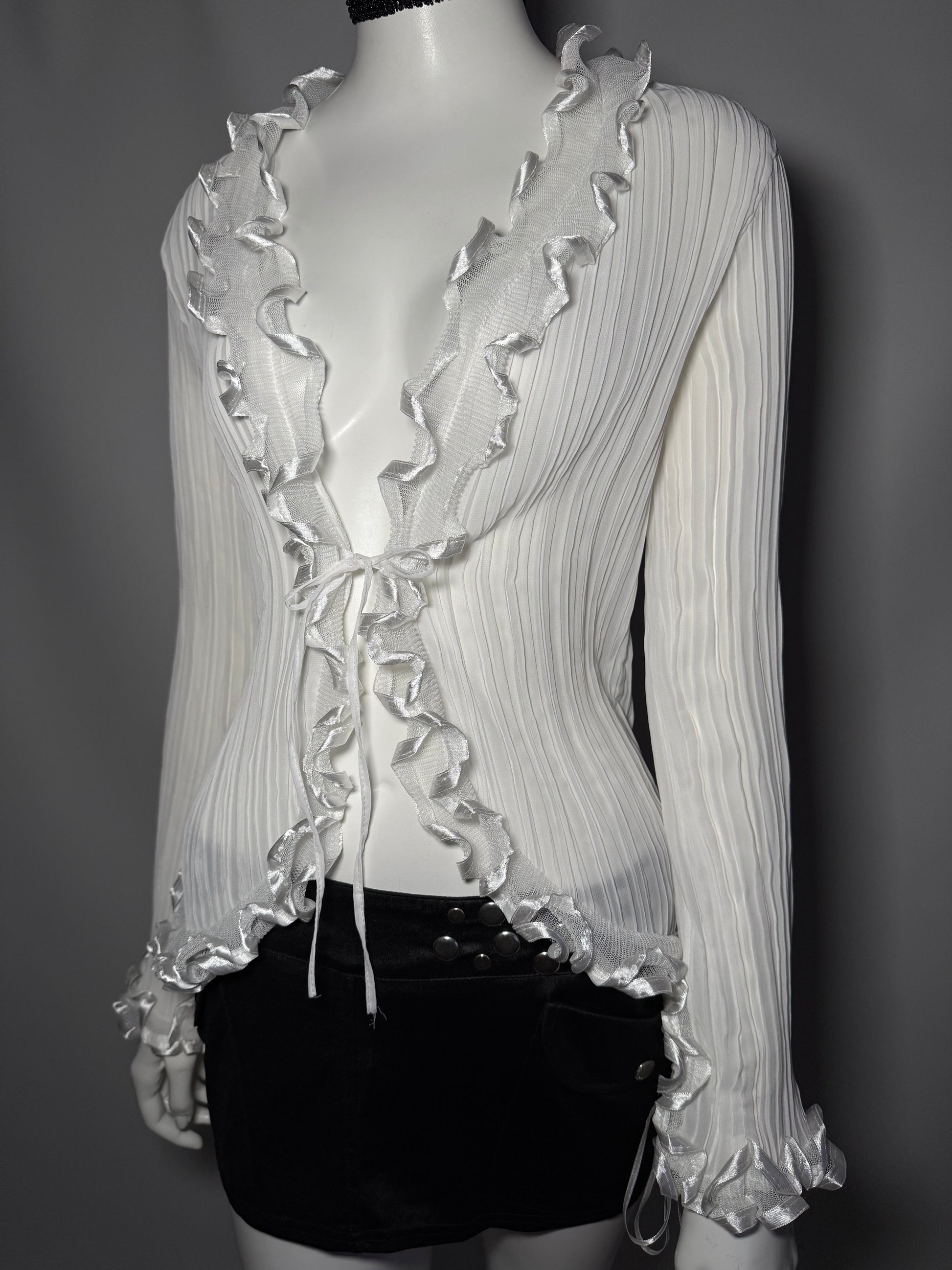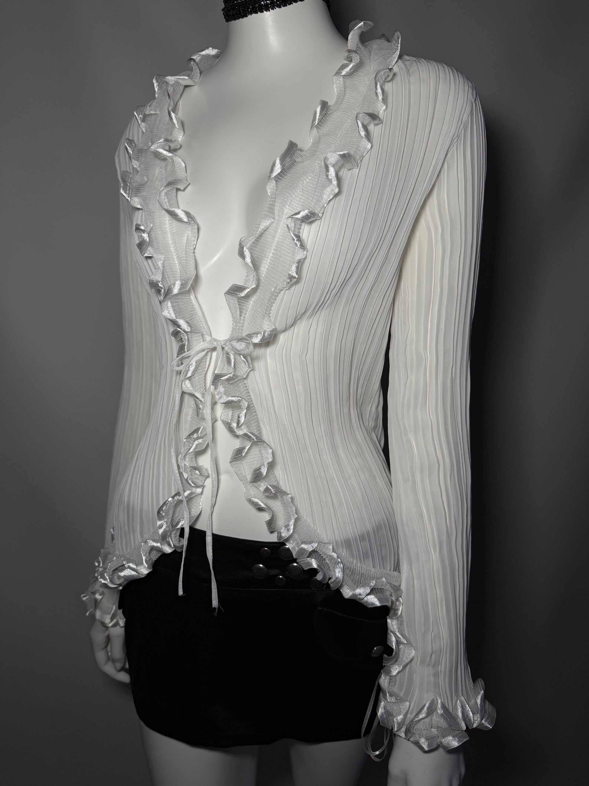 Vintage Y2K white ribbed blouse with tie-up front and ruffled trim.