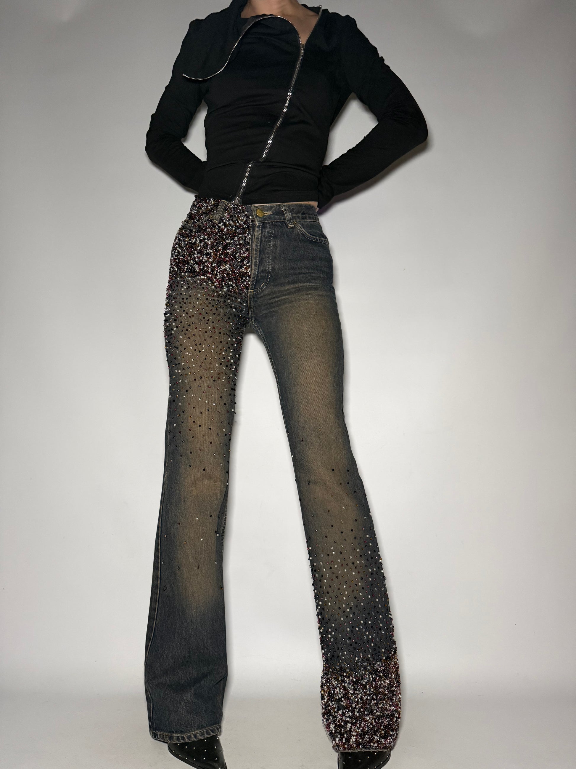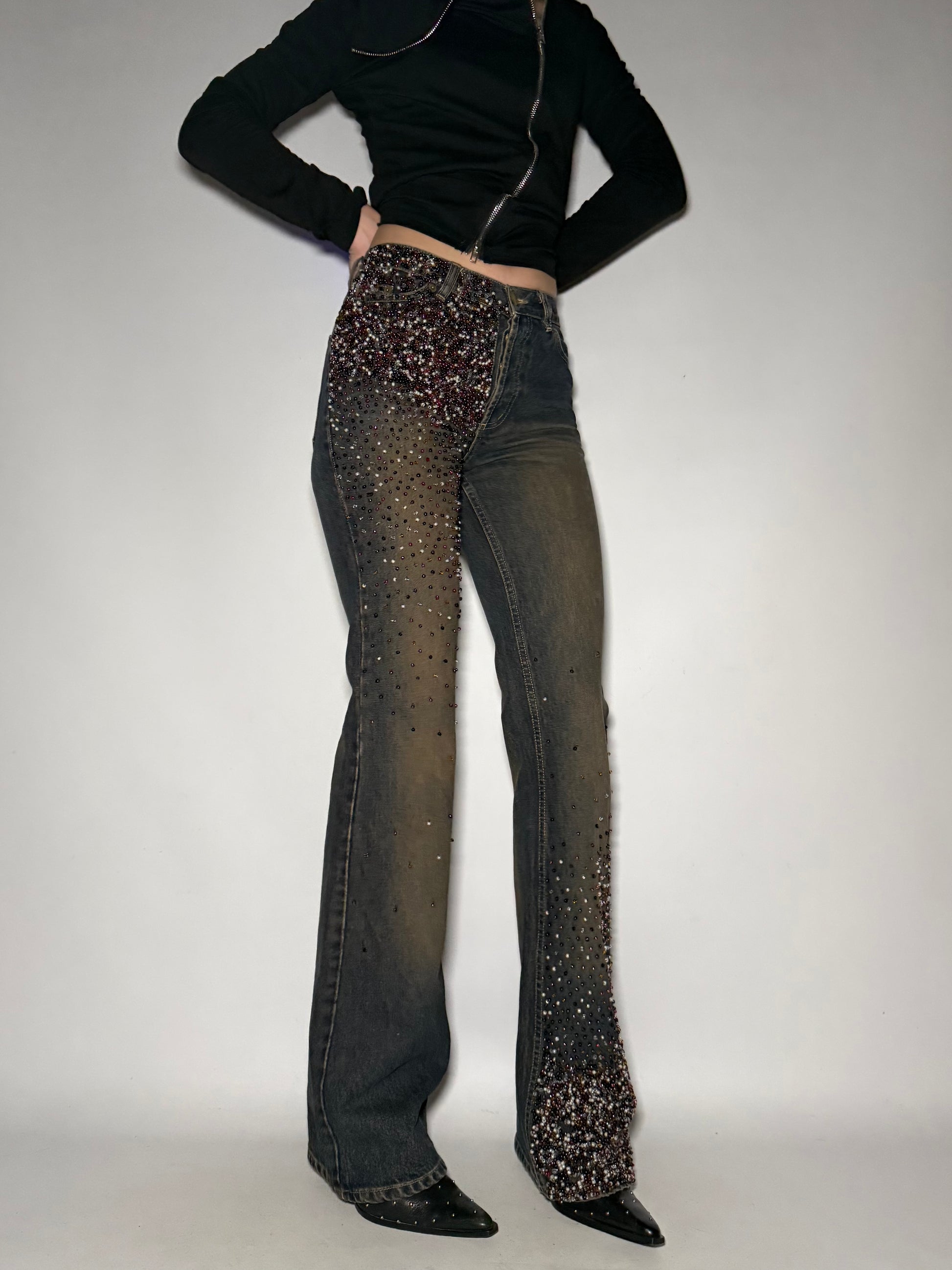 Vintage rust-tone straight-leg jeans with bead embellishment. Low rise, faded worn-in wash, gradient beading from top to hem. Good condition