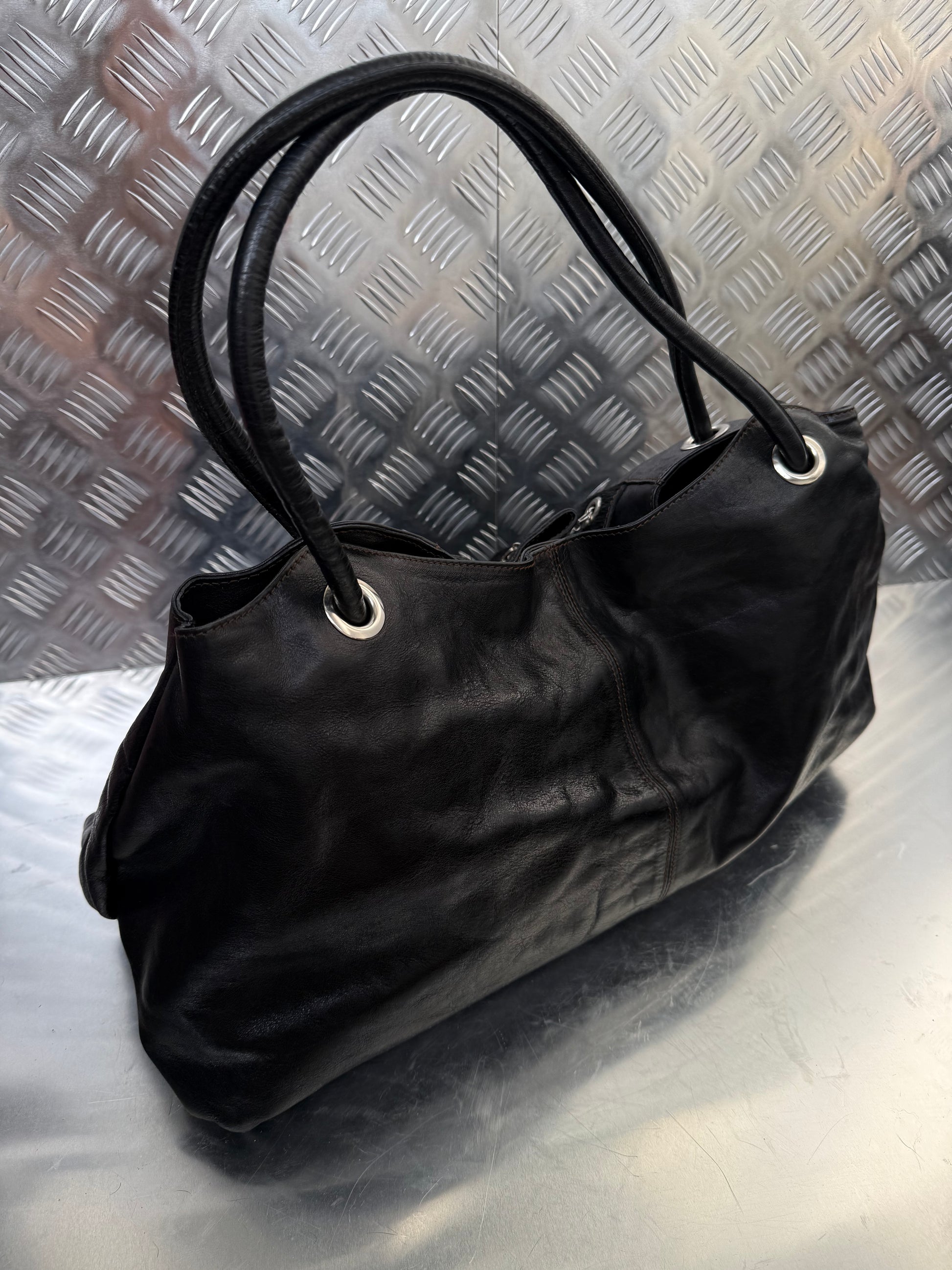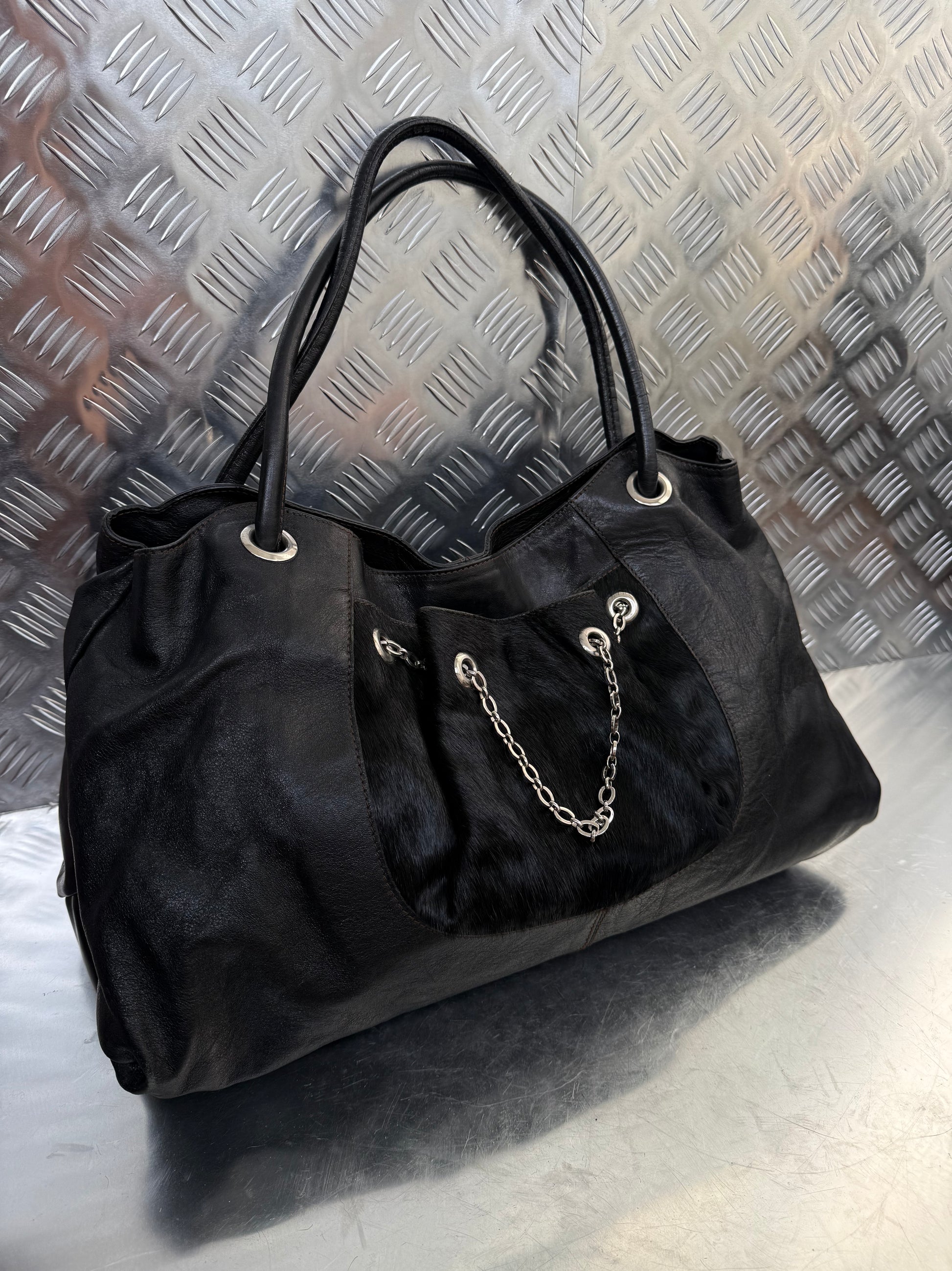 Vintage Furla leather bag with pony hair front pocket and chain detail. Soft natural leather, roomy and structured shape. Minor wear on pony hair area.