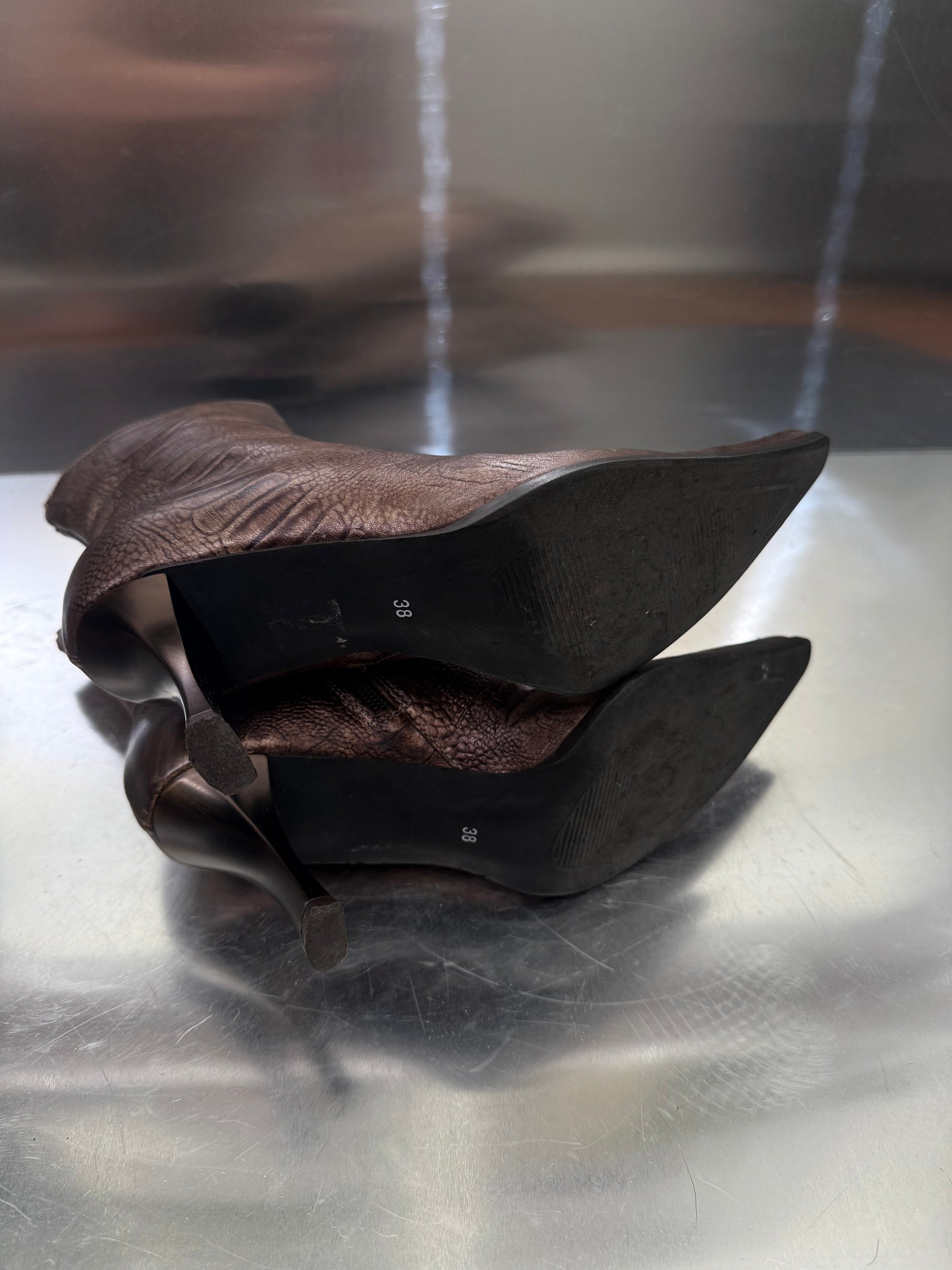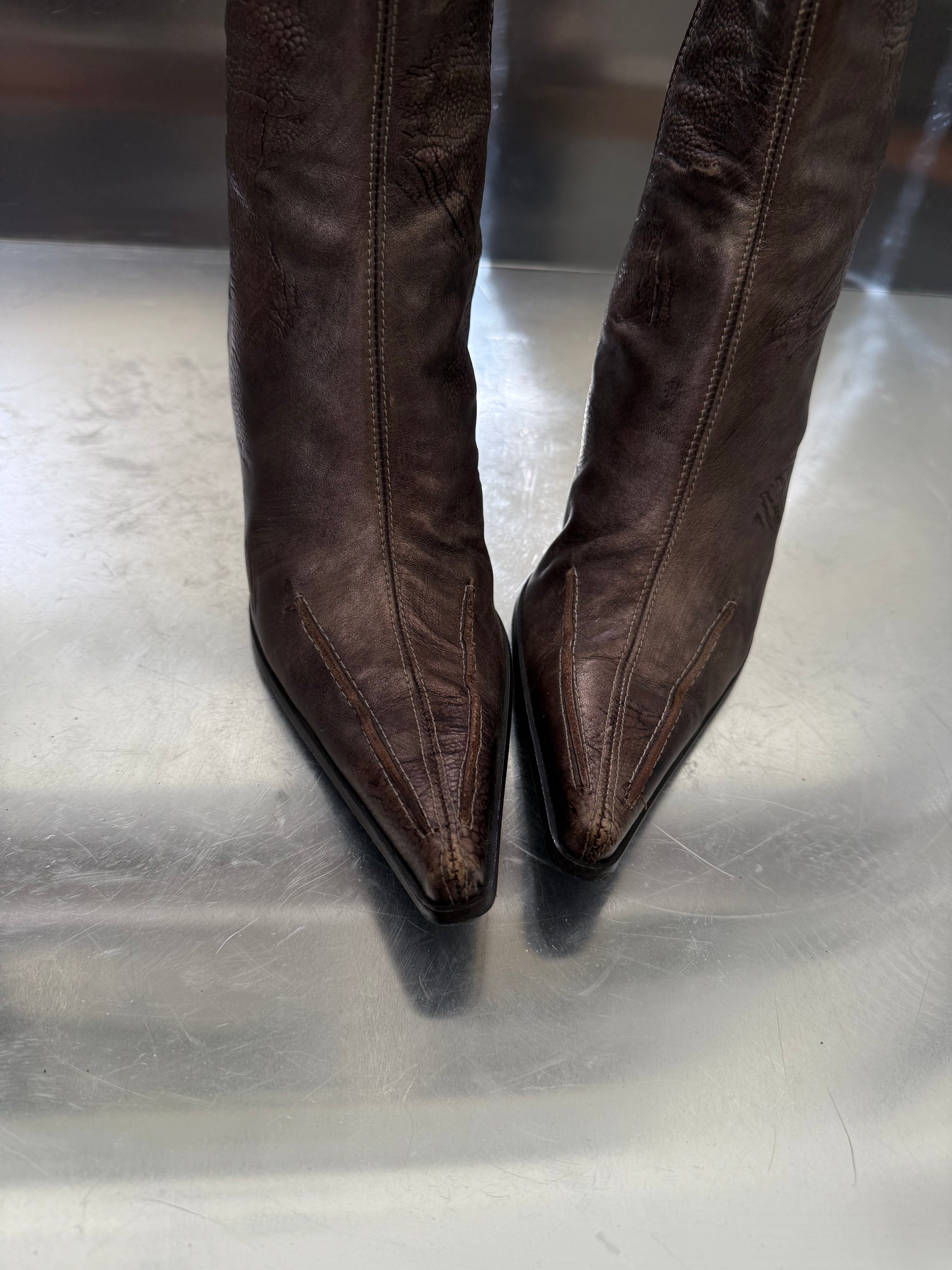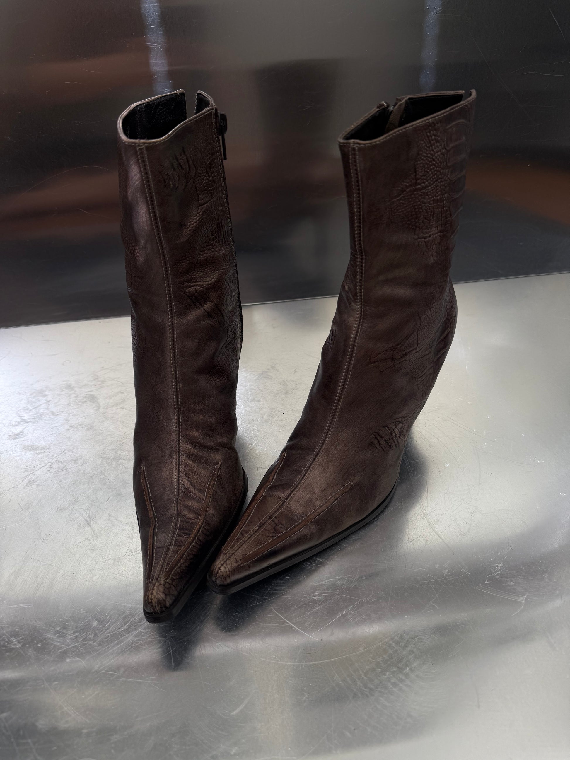 Vintage genuine leather boots in brown with pointed toe, slim heel and side zipper. Subtle textured finish for a bold 2000s vibe.