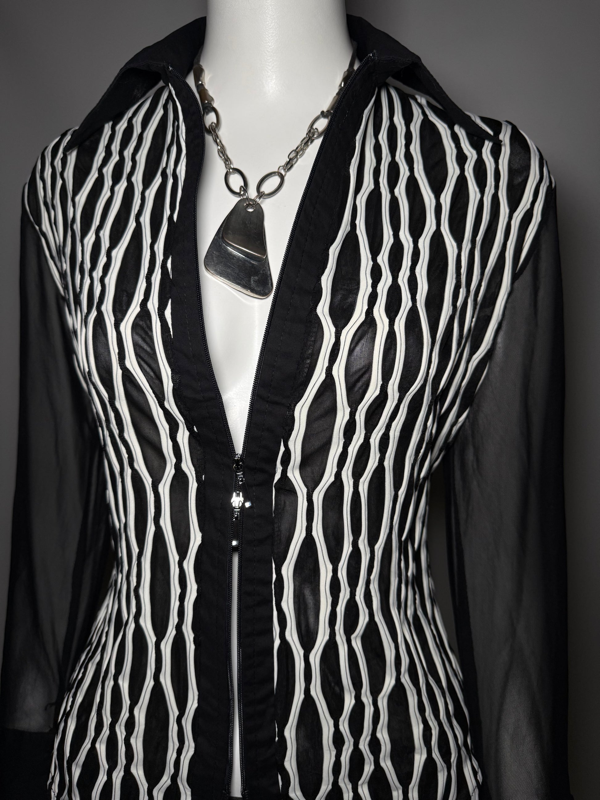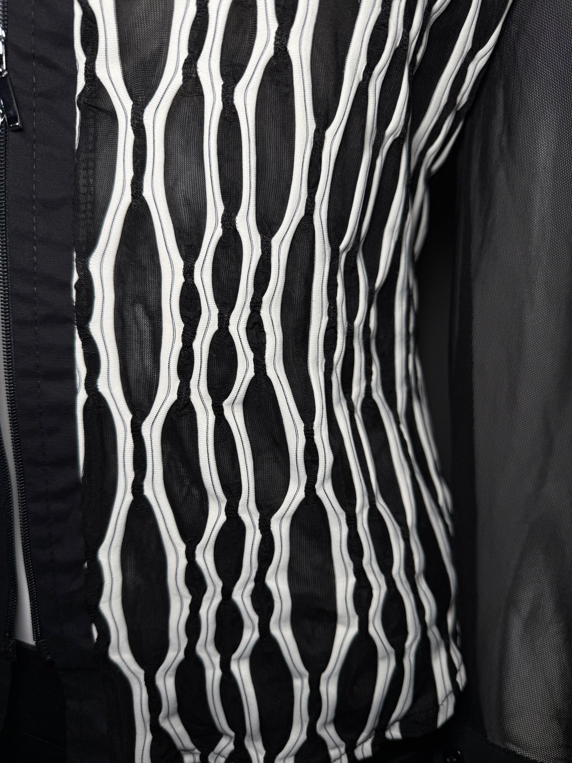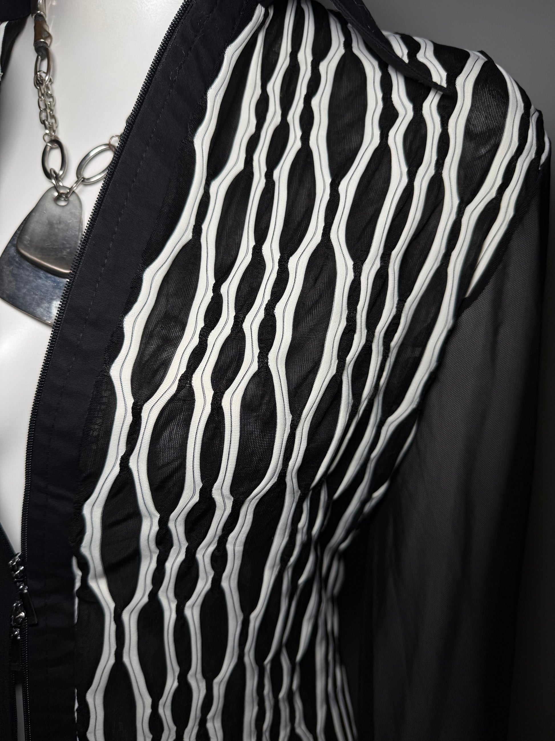 Features a unique black-and-white geometric pattern with sheer sleeves.