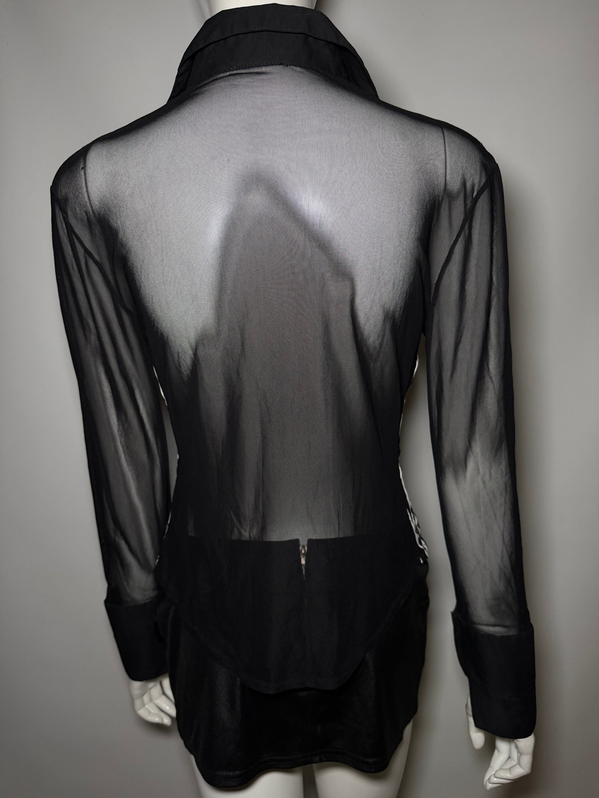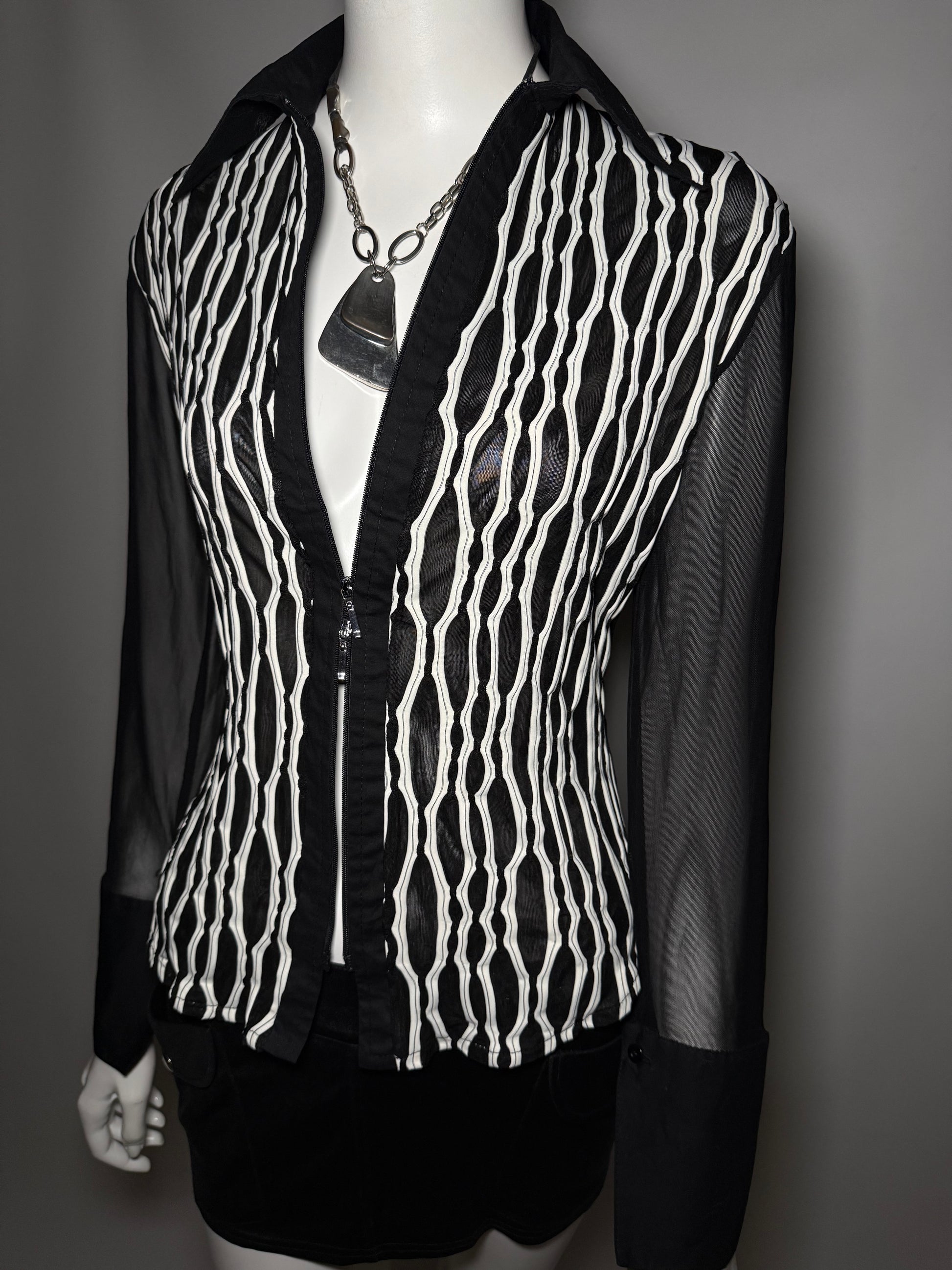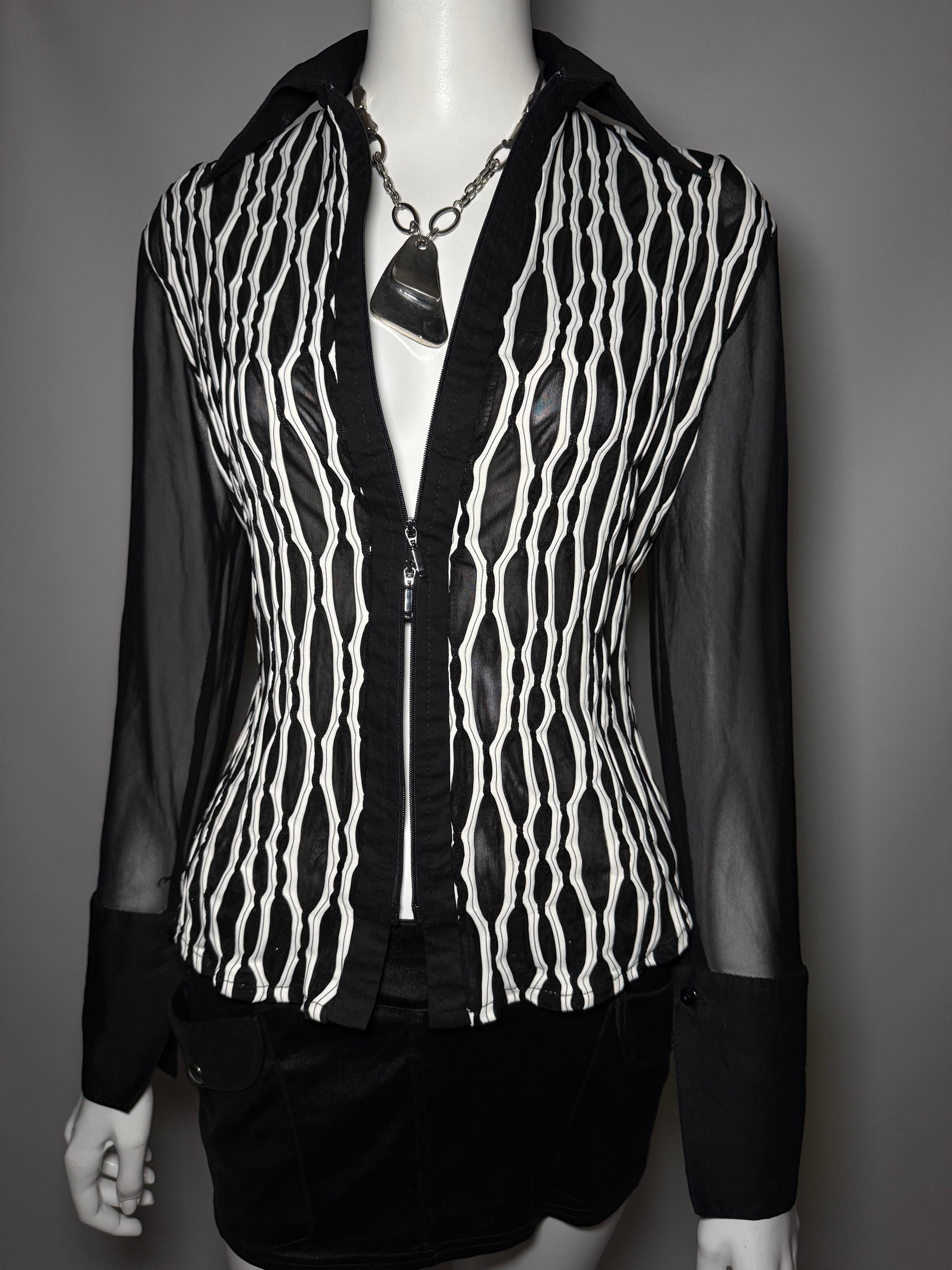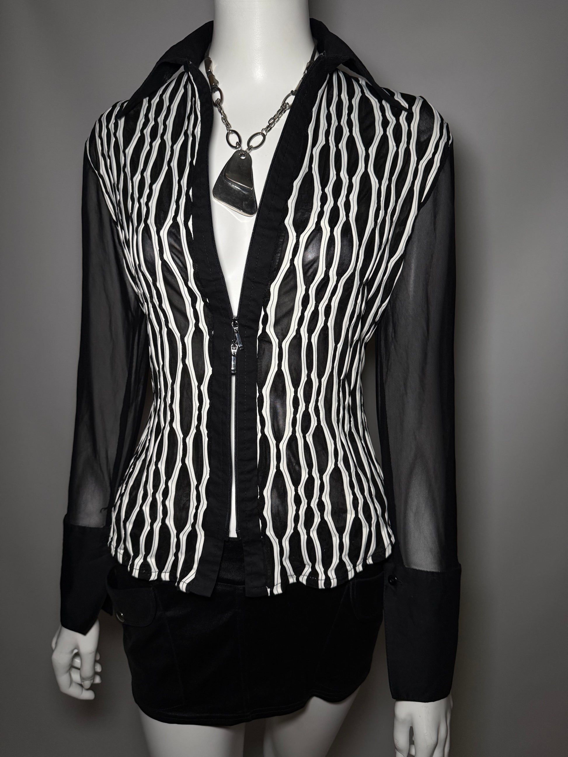 Features a unique black-and-white geometric pattern with sheer sleeves.