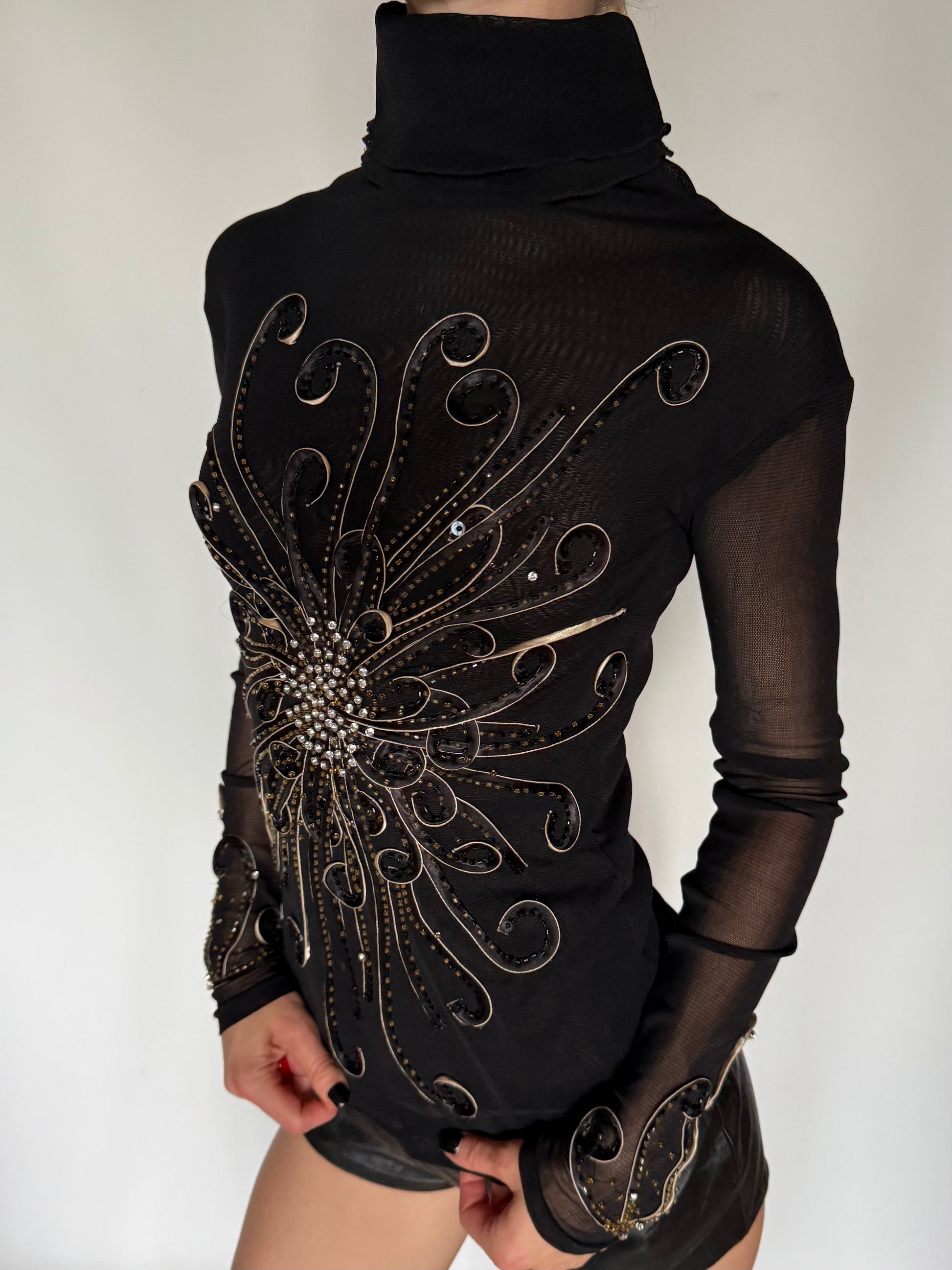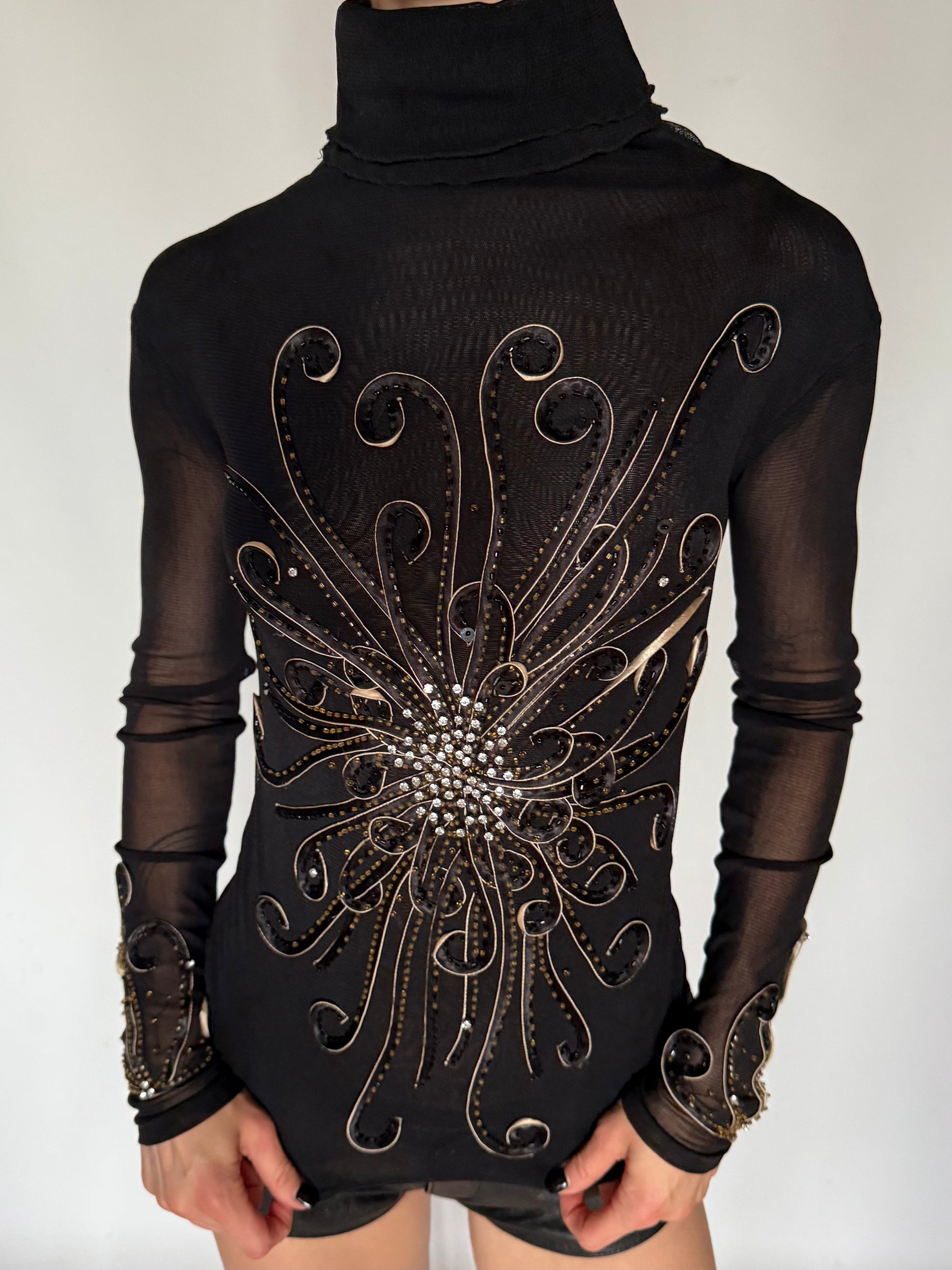 Прозора вінтажна еластична водолазка з ефектним променистим візерунком зі стразів і бісеру та опрацьованими манжетами; яскравий акцент для вечірніх образів.