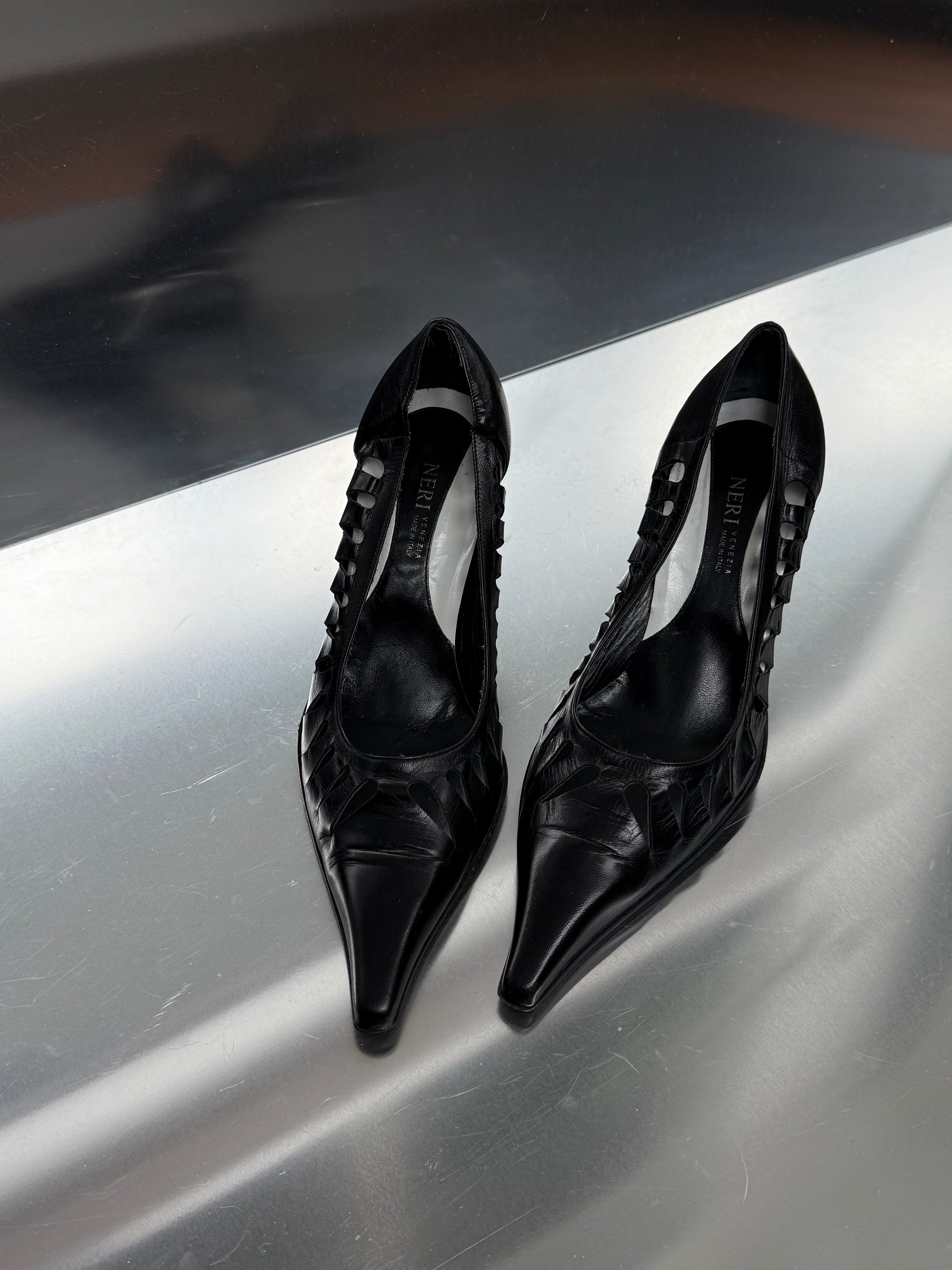 Slight scratch on the toe — barely noticeable. Made in Italy. Elegant and timeless pair for any vintage lover.