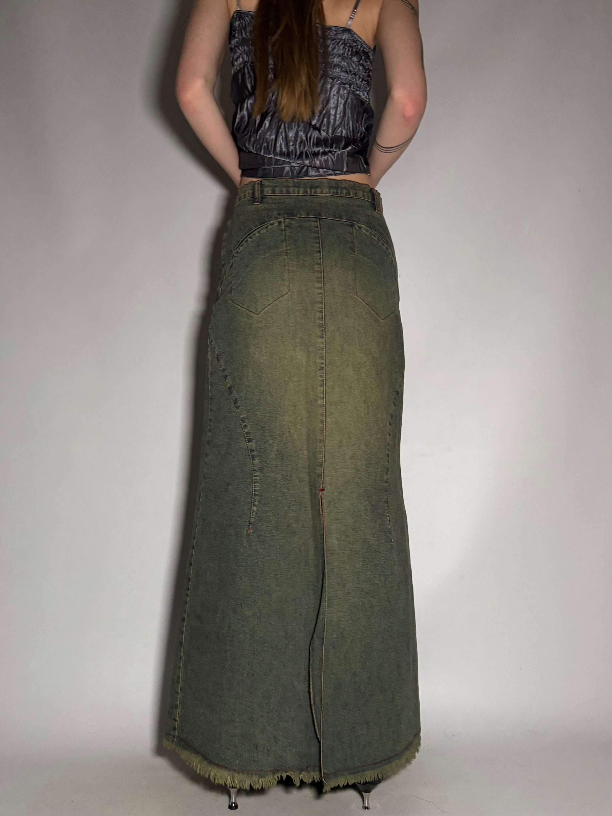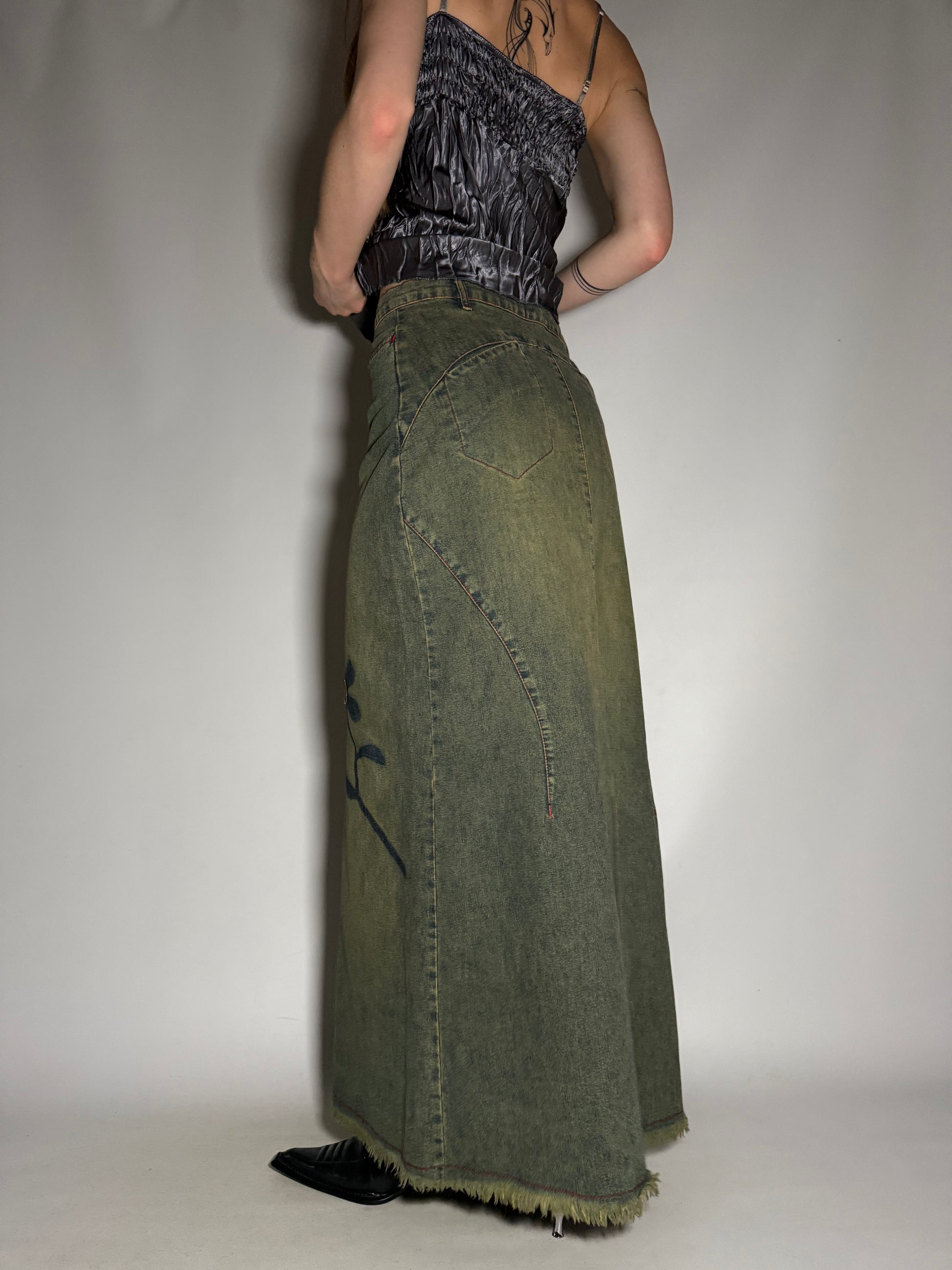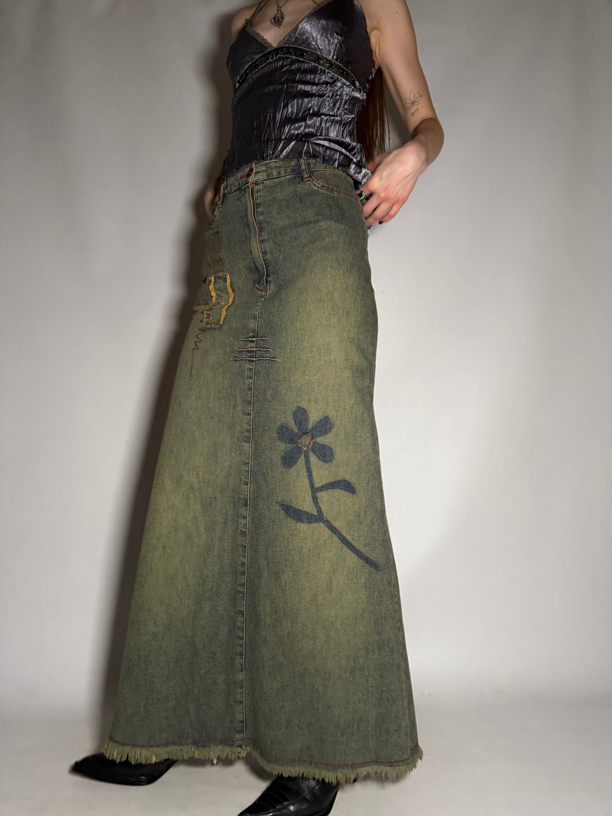 Vintage Maxi Denim Skirt with Flower Print and Contrast Stitching TWINKLING