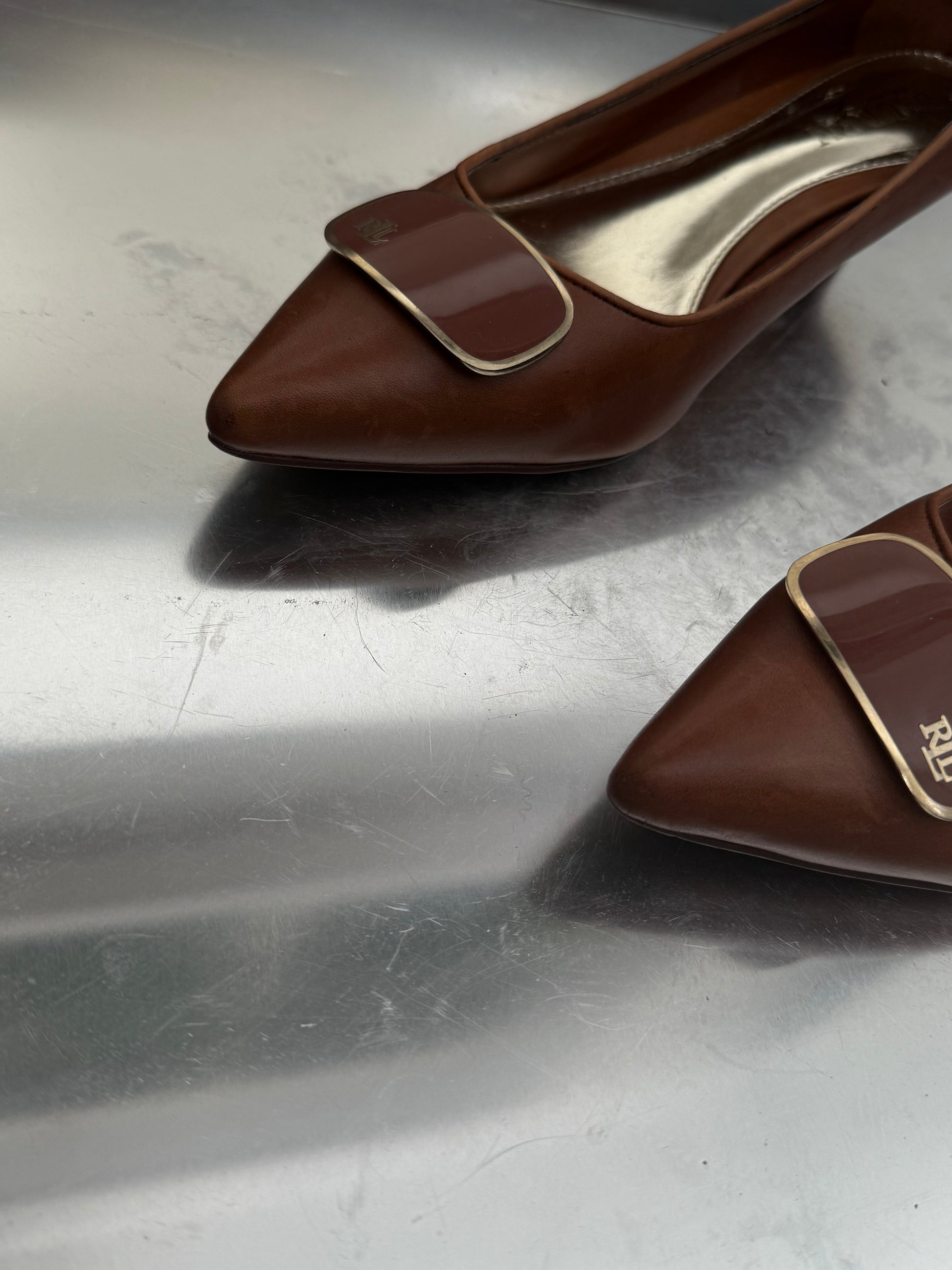 Chic vintage Ralph Lauren leather pumps in a rich brown tone, featuring a signature logo buckle on the front. The shape is elegant and timeless. There are some visible scratches on the leather – please zoom in on photos. Overall great condition and high quality.