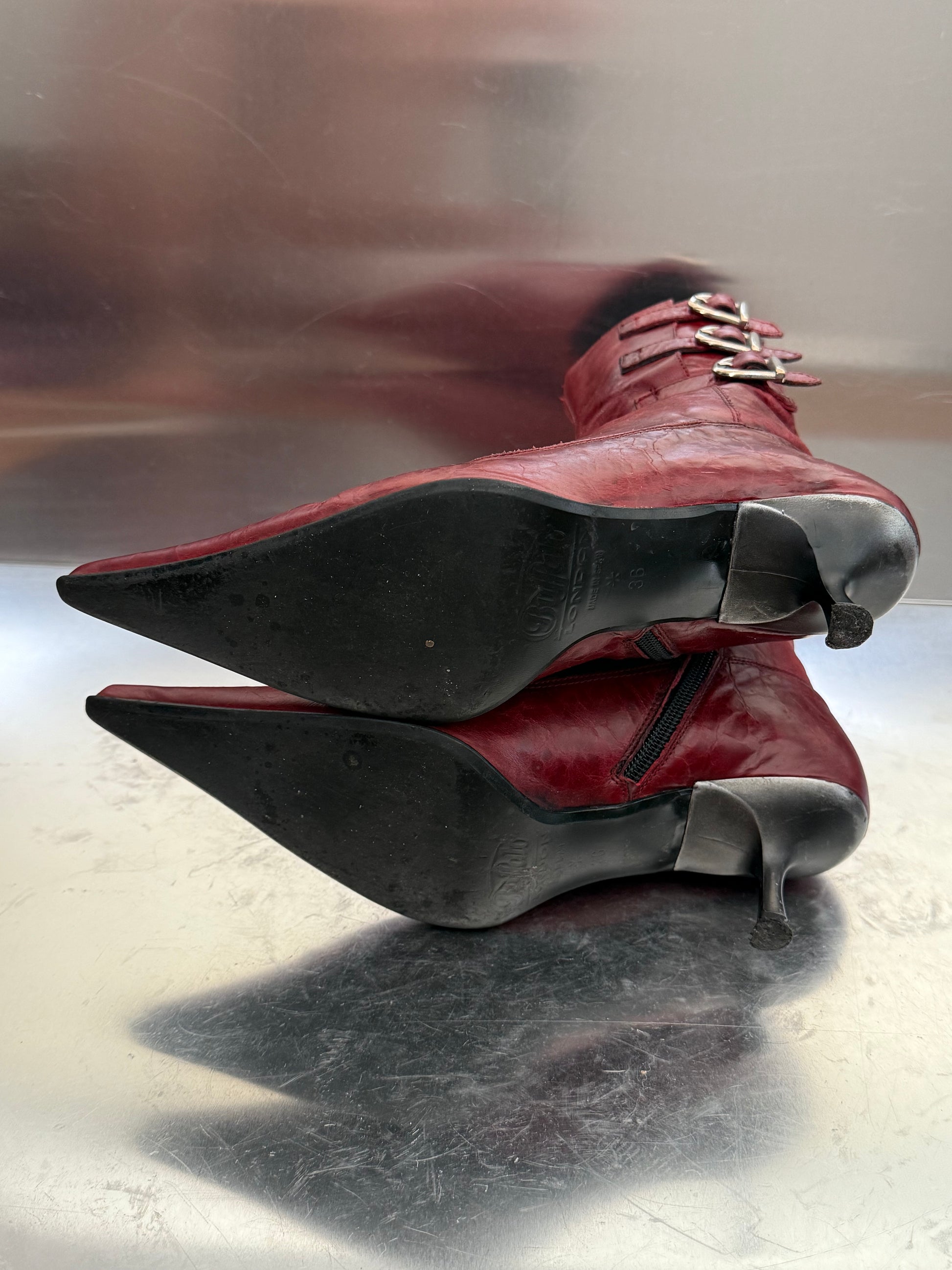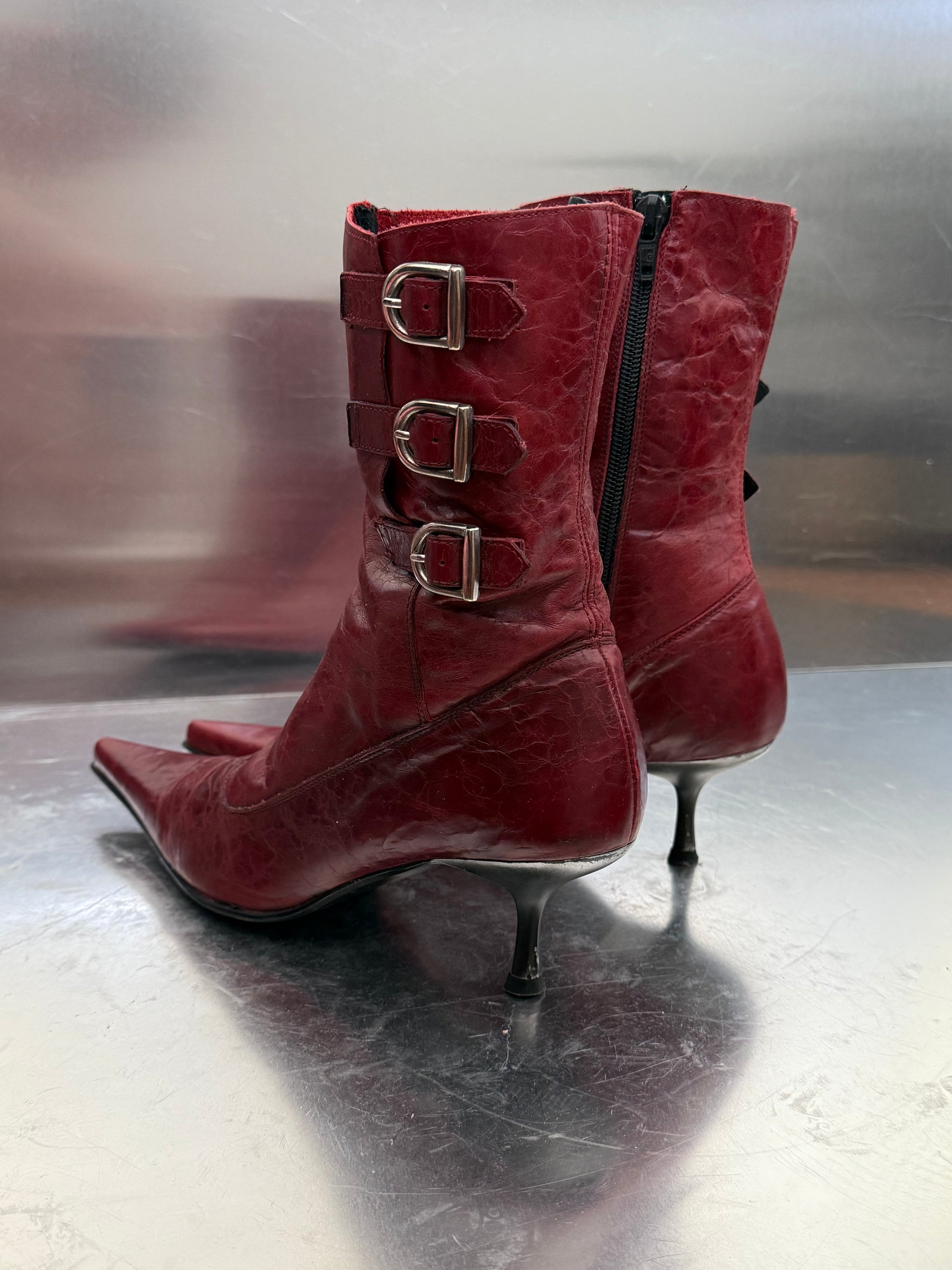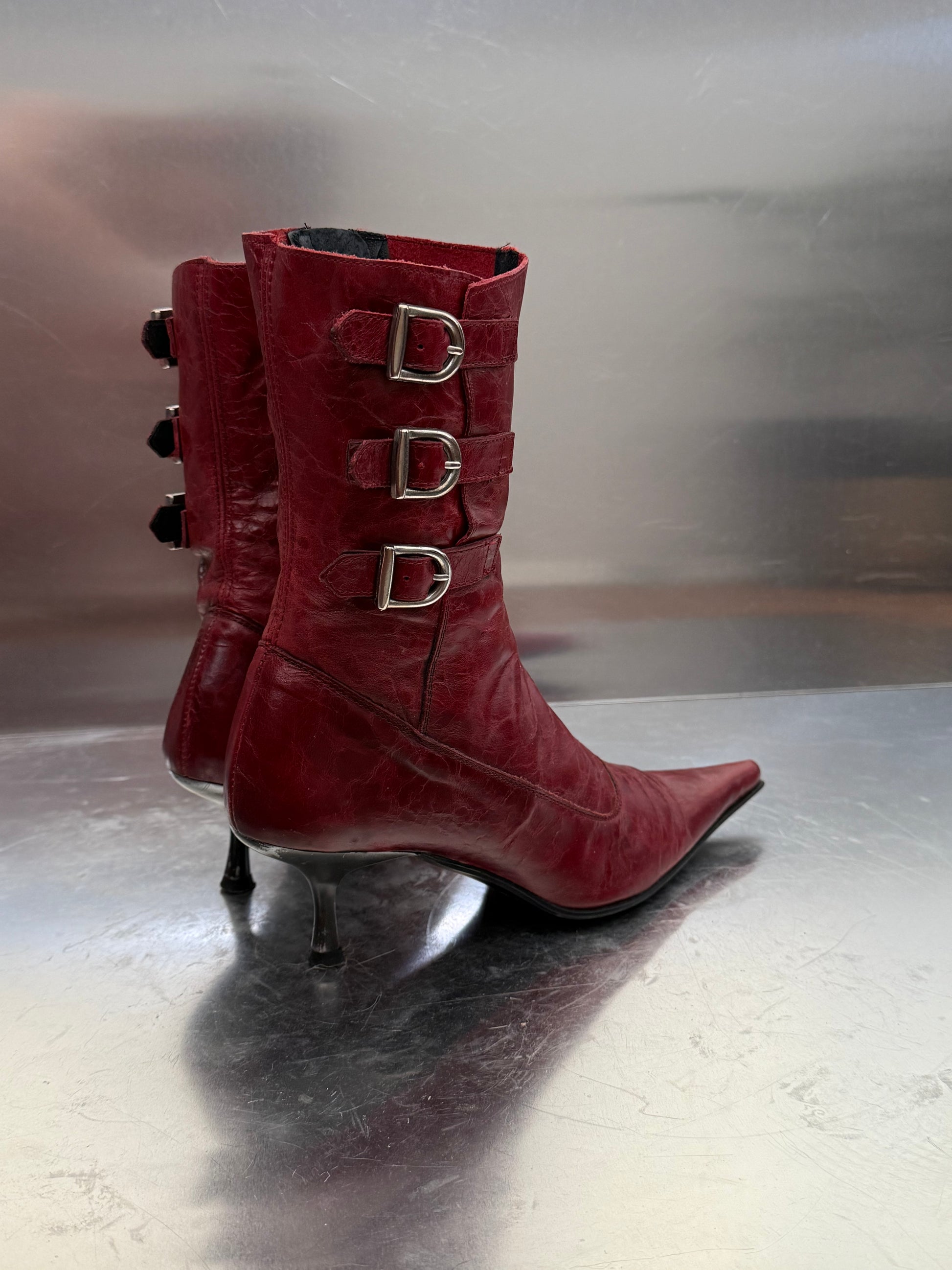 Eye-catching vintage red leather boots by Buffalo with pointed toes, stiletto heels, and triple buckle detail on the side. Soft genuine leather. Visible scuffs on the heels and light creasing on the toes — please zoom in to view the condition. Still in good overall shape and full of character.