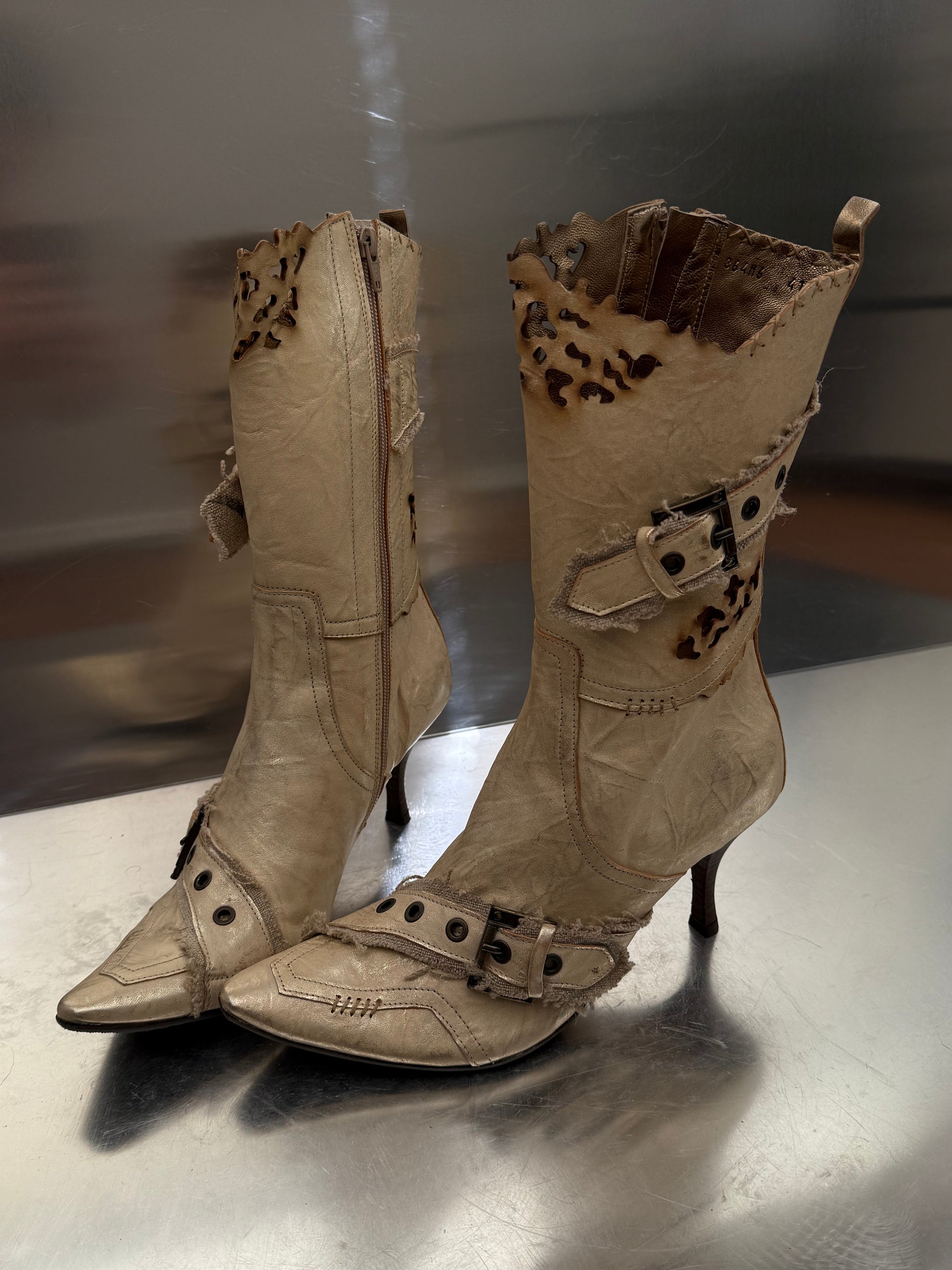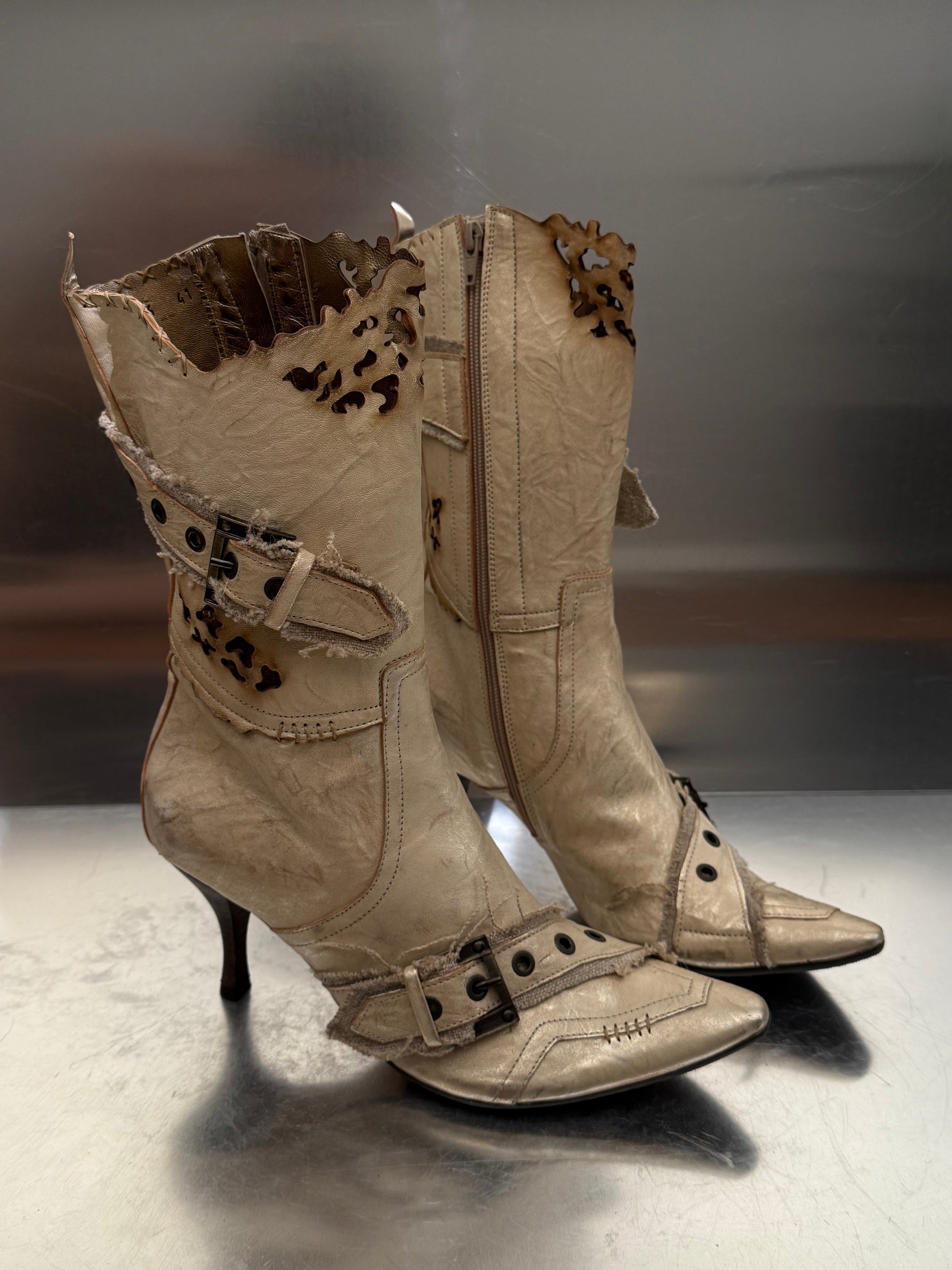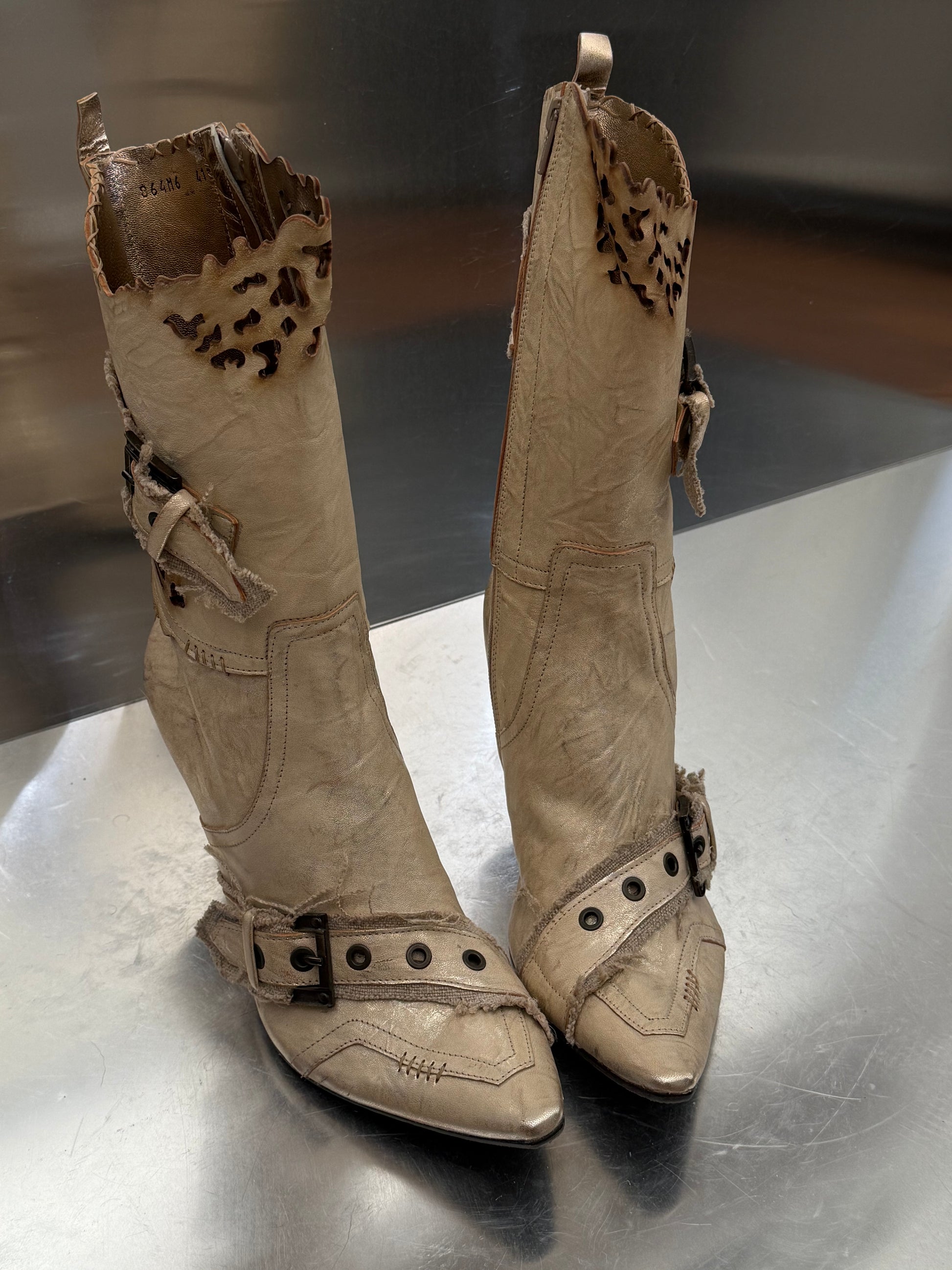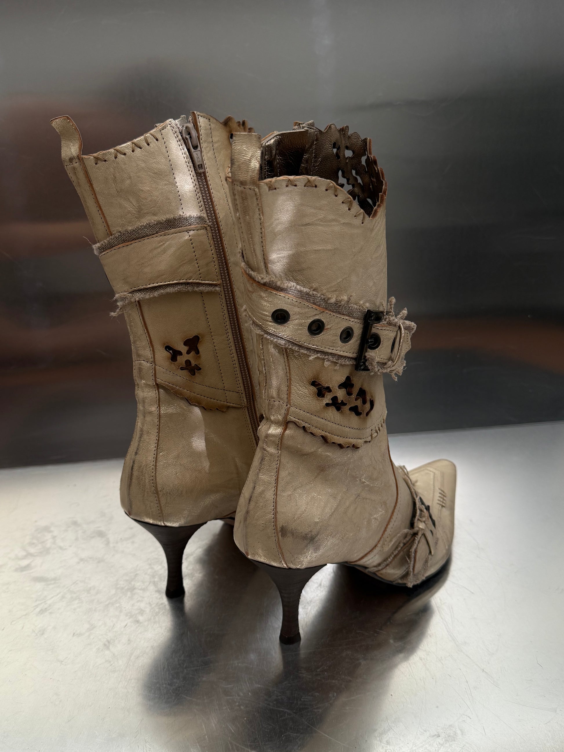 Rare vintage beige leather boots with decorative cut-out details and double buckle straps. Made in Italy. They are new, but note that since the boots are vintage, the heel caps (plastic) may need replacement. Officially marked as size 41, but they run very small and fit more like a 39 (25.5 cm). Please carefully review all photos to assess the exact condition.