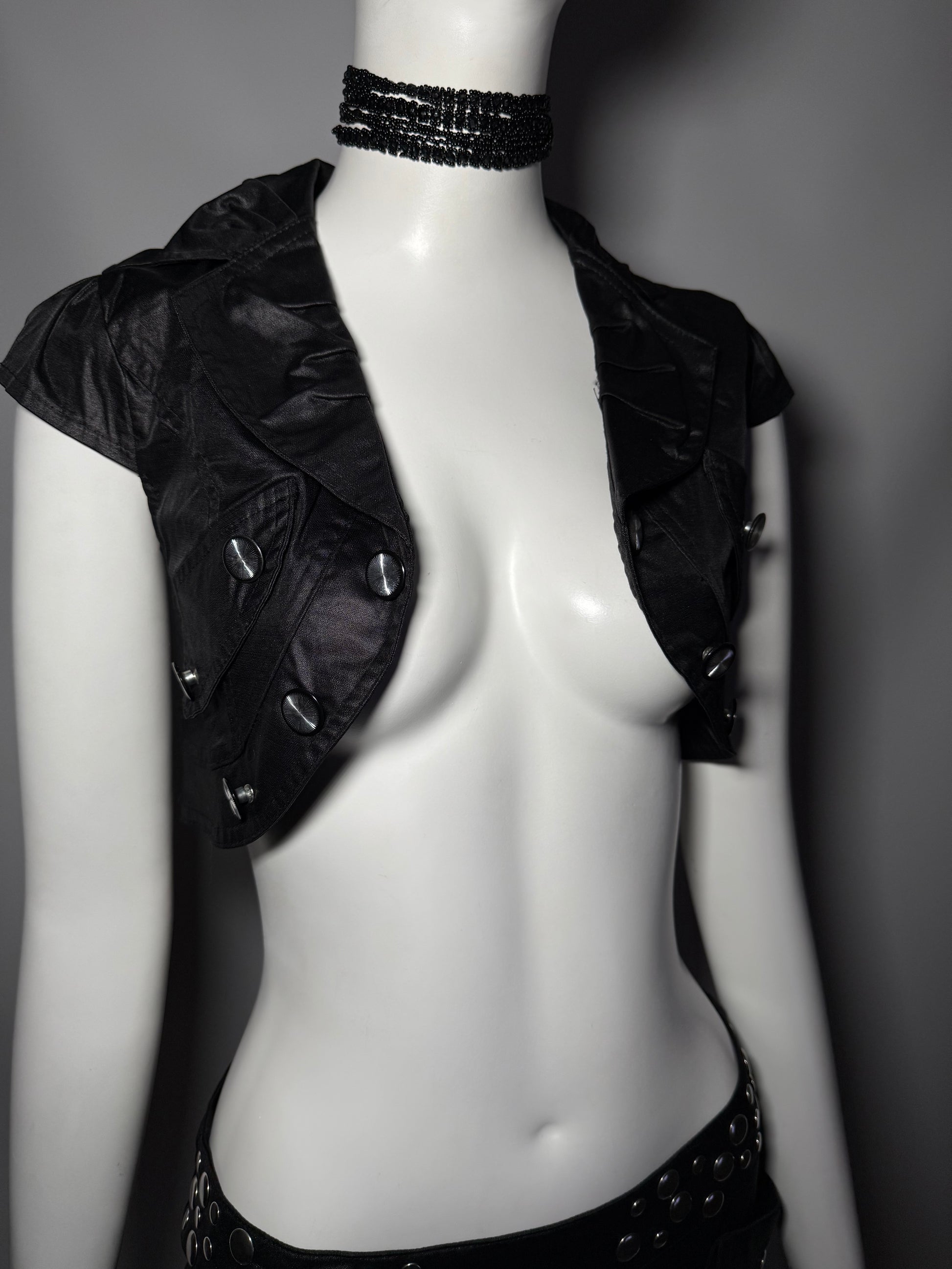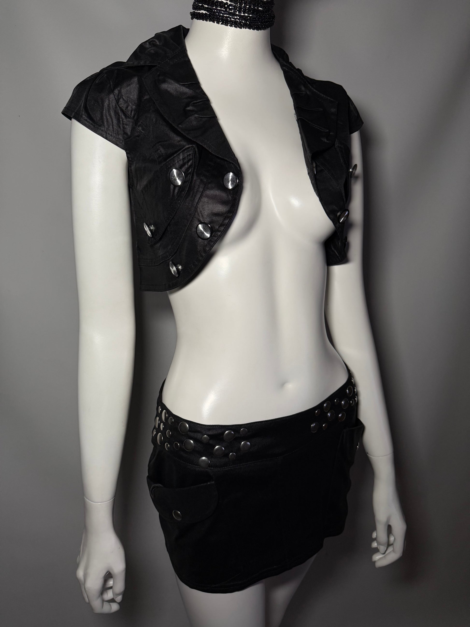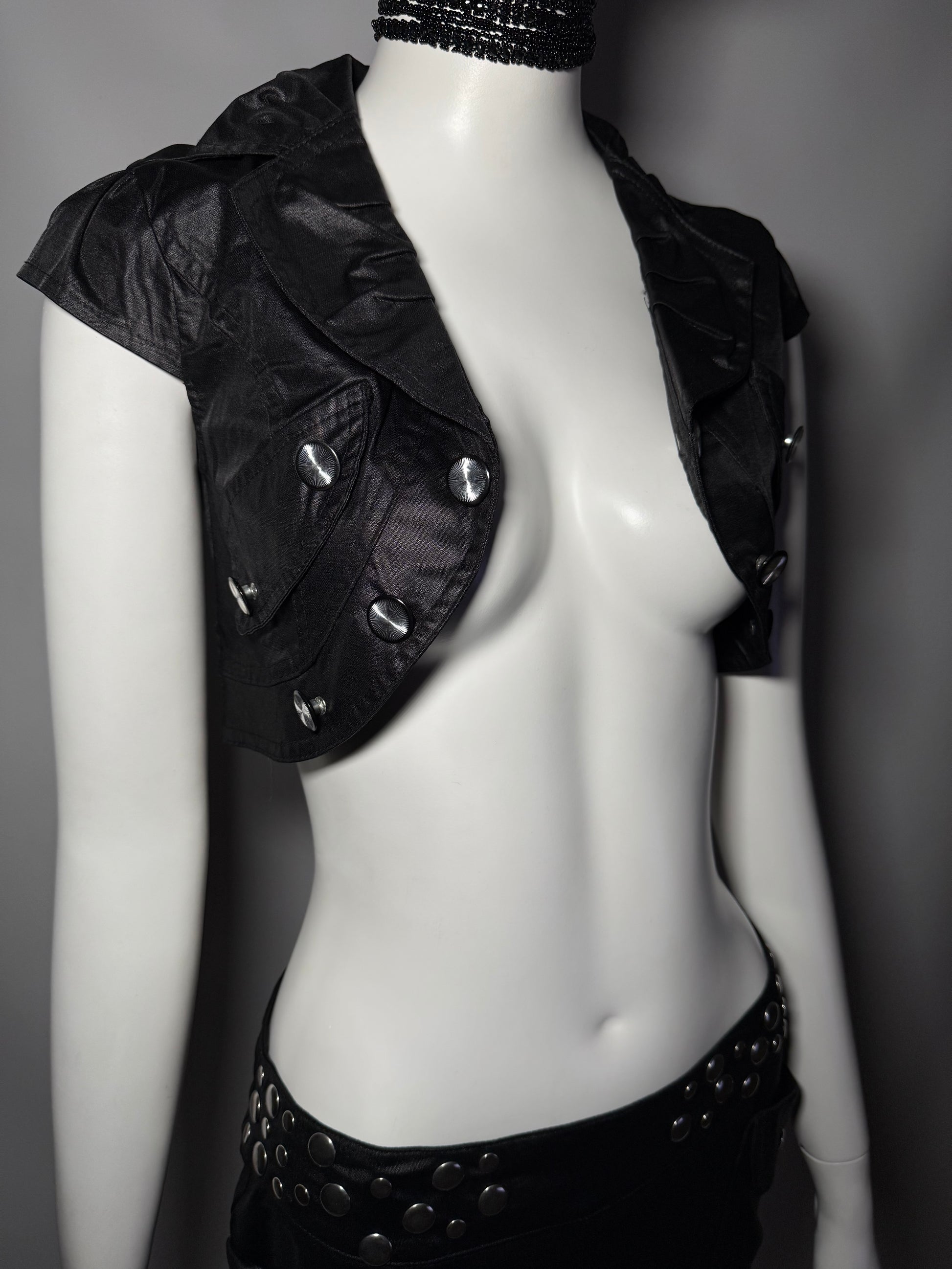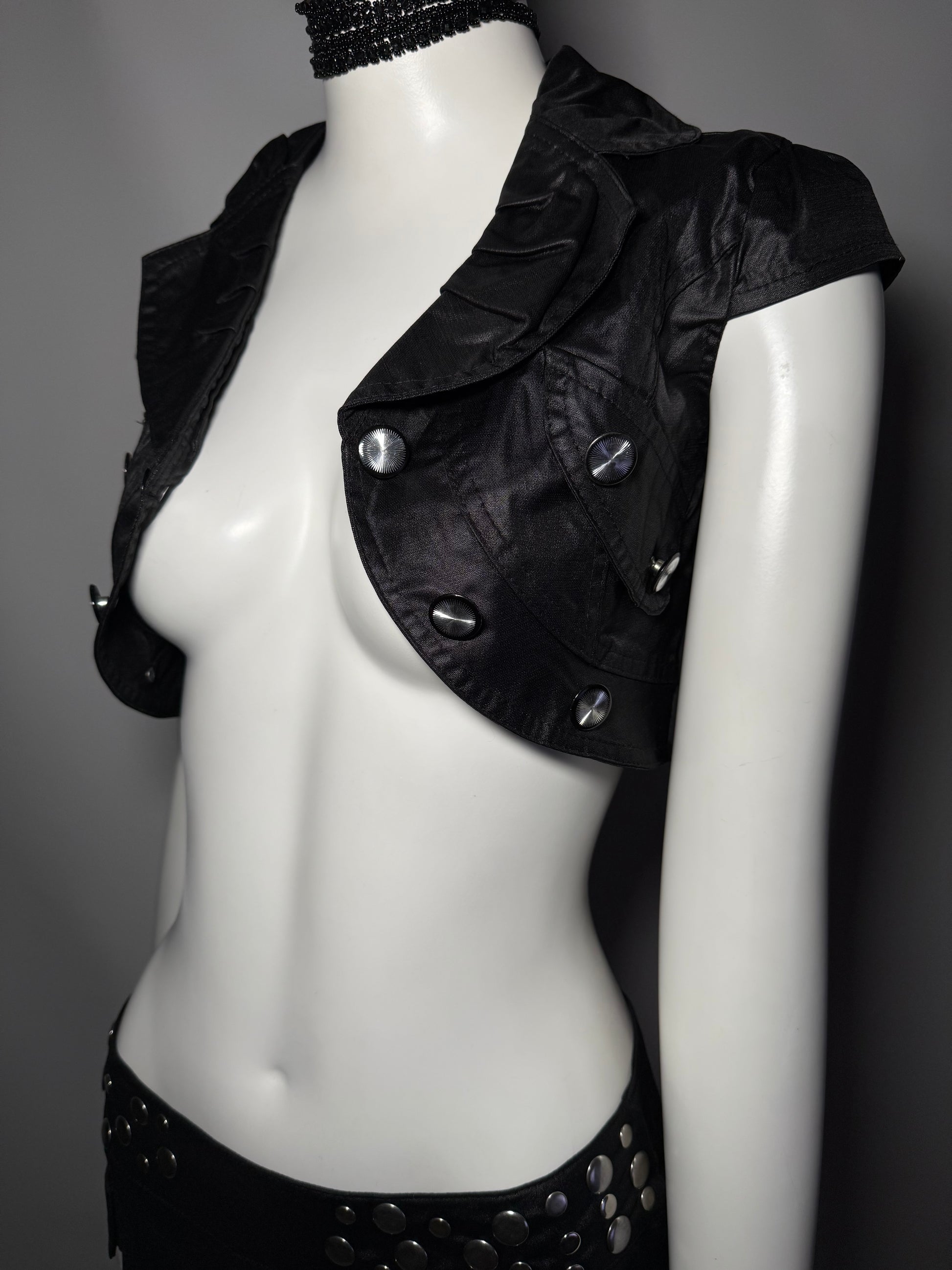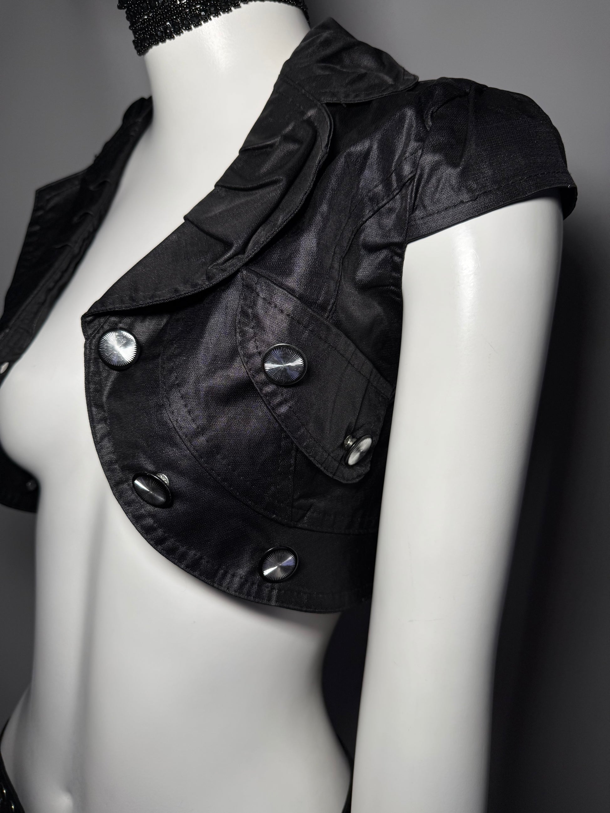 Cropped Y2K bolero made from structured black denim with a subtle shine and bold metallic buttons. Strong shoulder silhouette and edgy detailing.