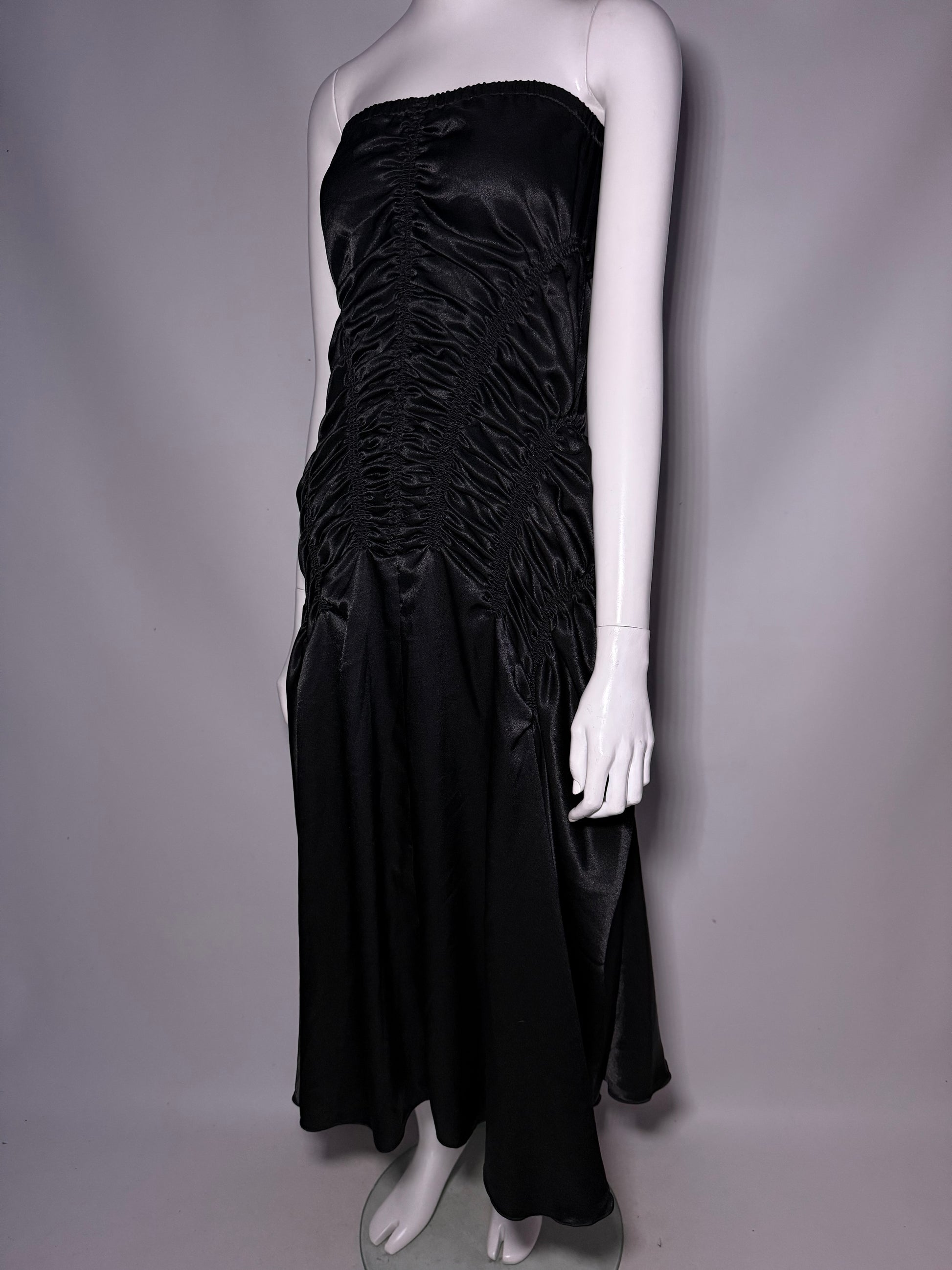 Vintage Y2K strapless black satin maxi dress with ruched detailing.